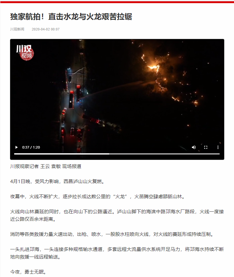 2020年4月1日晚19时许,四川凉山州西昌泸山突发山火,川观新闻记者以最快速度直抵火灾现场。1分20秒的短视频现场新闻《独家航拍!直击水龙与火龙艰苦拉锯》通过无人机航拍展示了宏大的火龙、水龙交战全貌,现场感、震撼力极强。