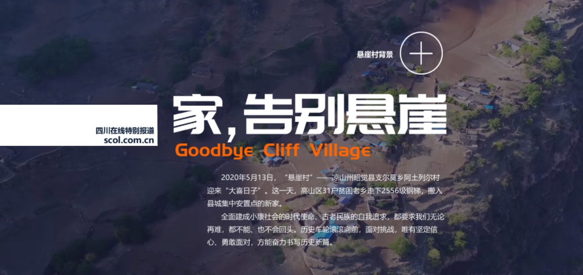 2020年5月12日,“悬崖村”村民告别天梯和悬崖,陆续搬入县城的新家,四川在线在当天推出聚合类专题《家,告别悬崖》,采用全屏自适应设计,通过使用全屏“悬崖村”航拍视频作为背景,带来“一步跨千年”强烈视觉冲击。