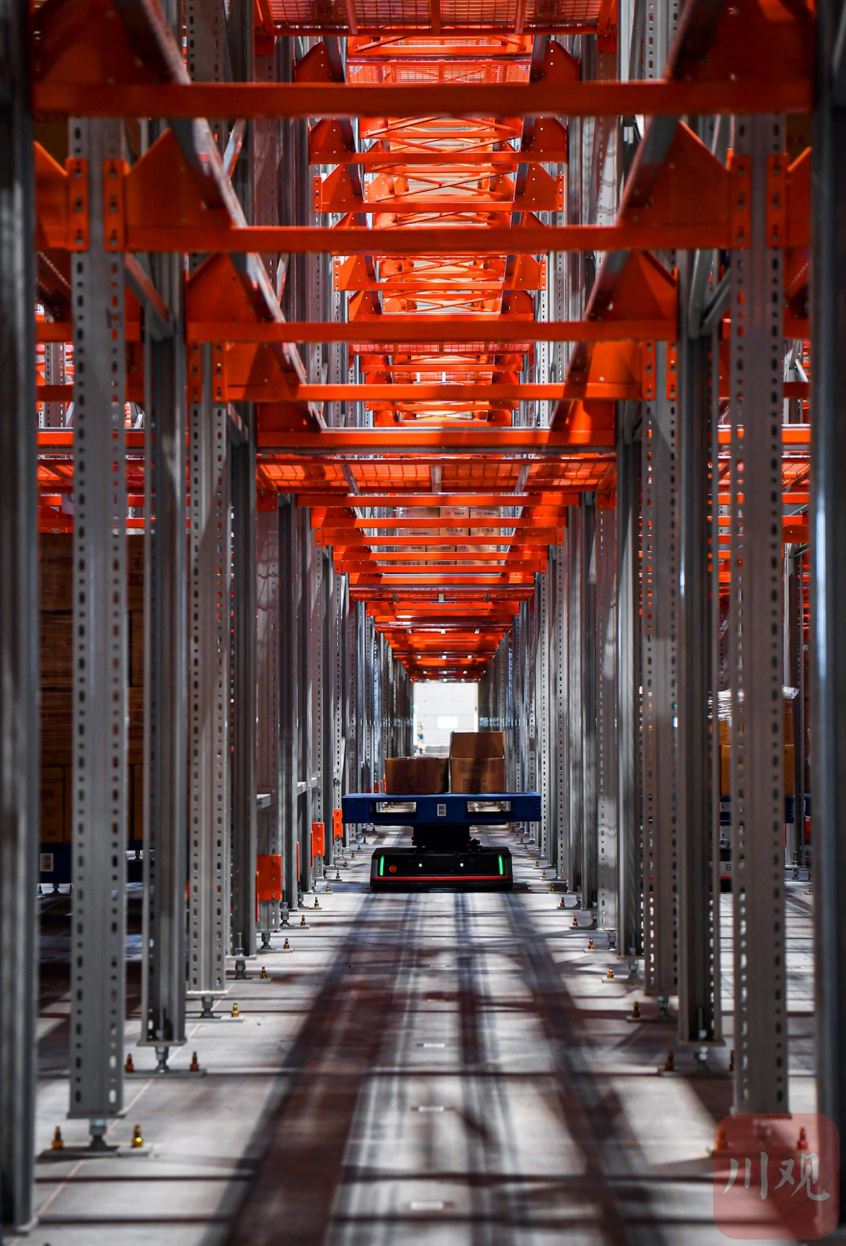 广汉市的智能货仓内每个“地狼”最高承重1000kg,依靠遍布地上的一个个二维码规划、引导路径,再依靠自带的传感器避免碰撞,保证了“地狼”运送货物时互不干扰,大大提高分拣效能和准确度。
