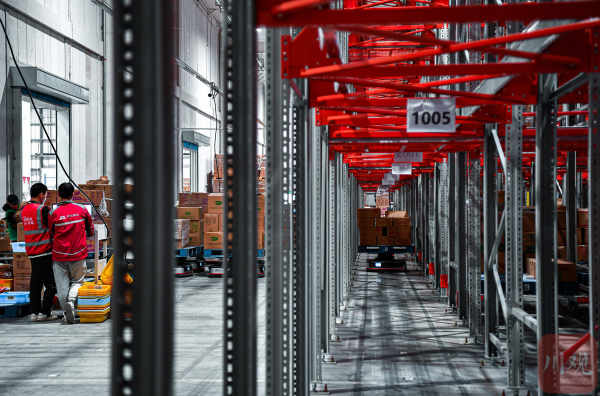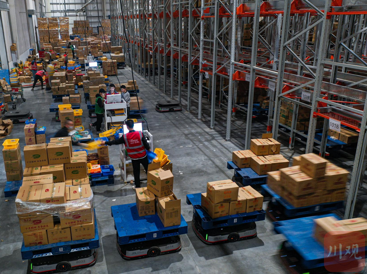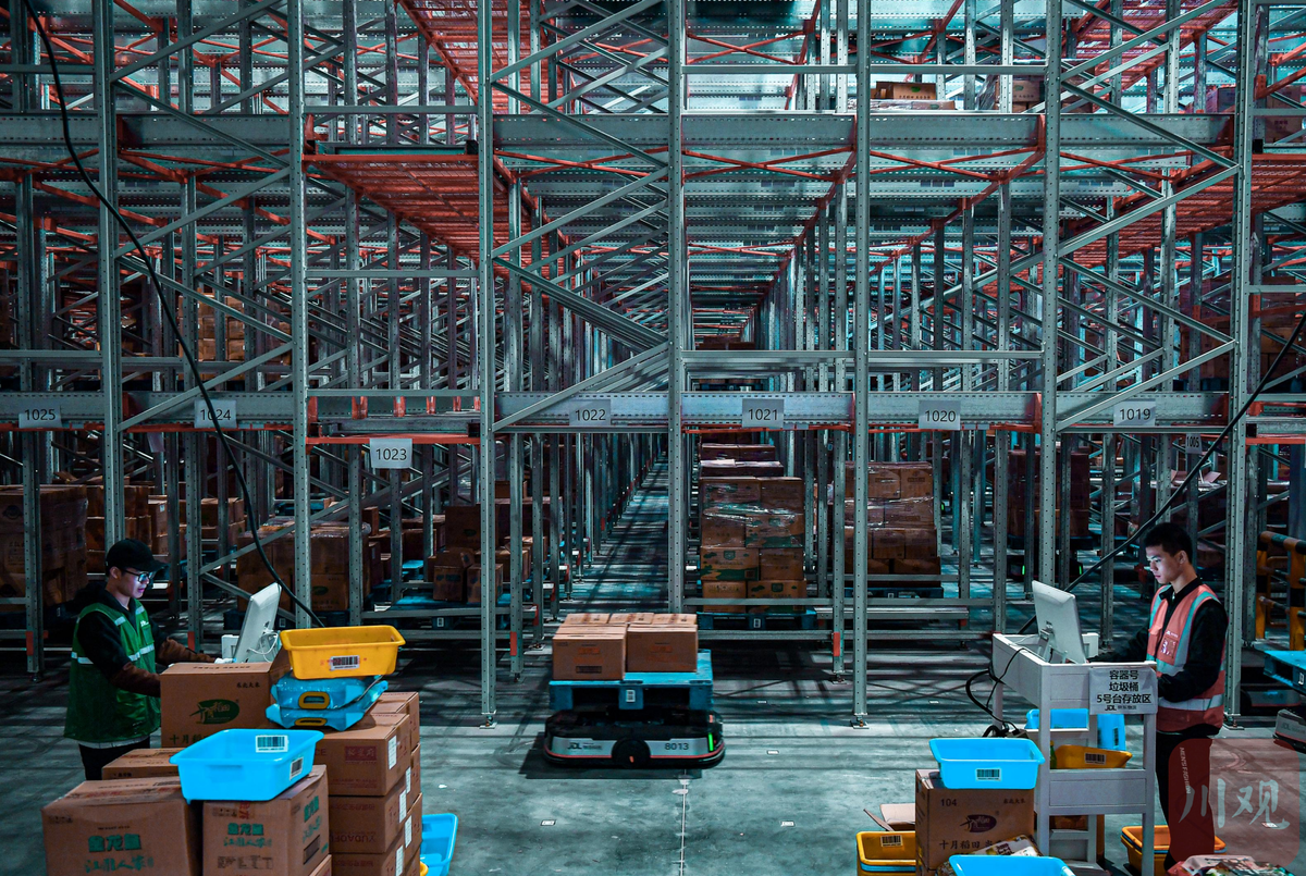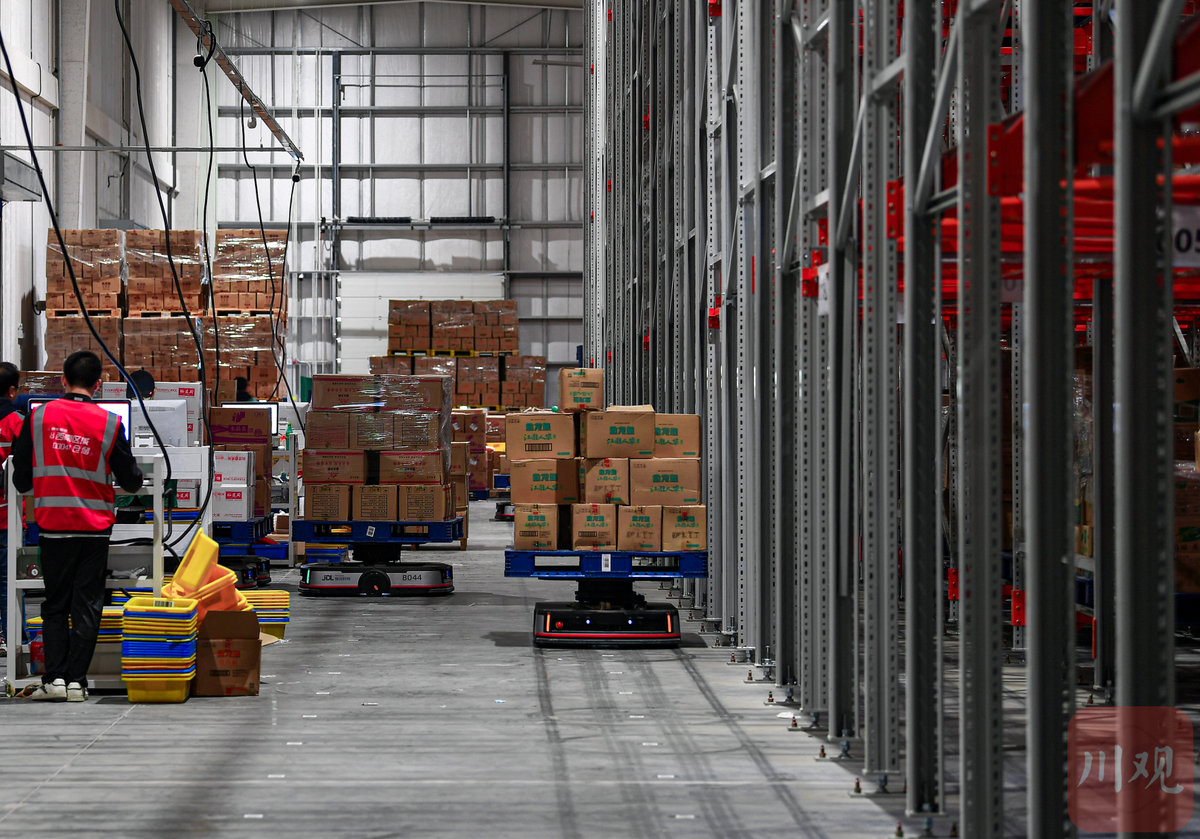11月8日,“双十一”前夕,德阳广汉市亚一米面仓内,100多台机器人设备,各自“背”着货物在货架内24小时不停歇的穿梭,井然有序地为工作人员传送“快递”。机器人从拿货到将货物送到工作台都是以分钟级的速度完成的。