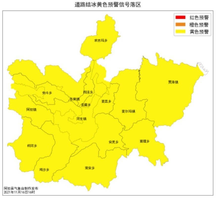 ▲ 还要提醒大家,阿坝县气象台第3次确认,11月16日16时49分发布的道路结冰黄色预警信号继续有效。