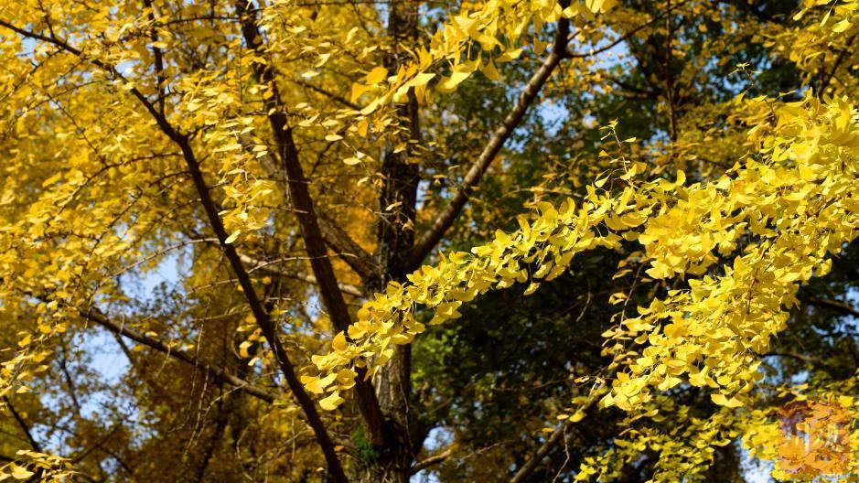 初冬的阳光从树林间的空隙透过,洒在金黄的银杏上,