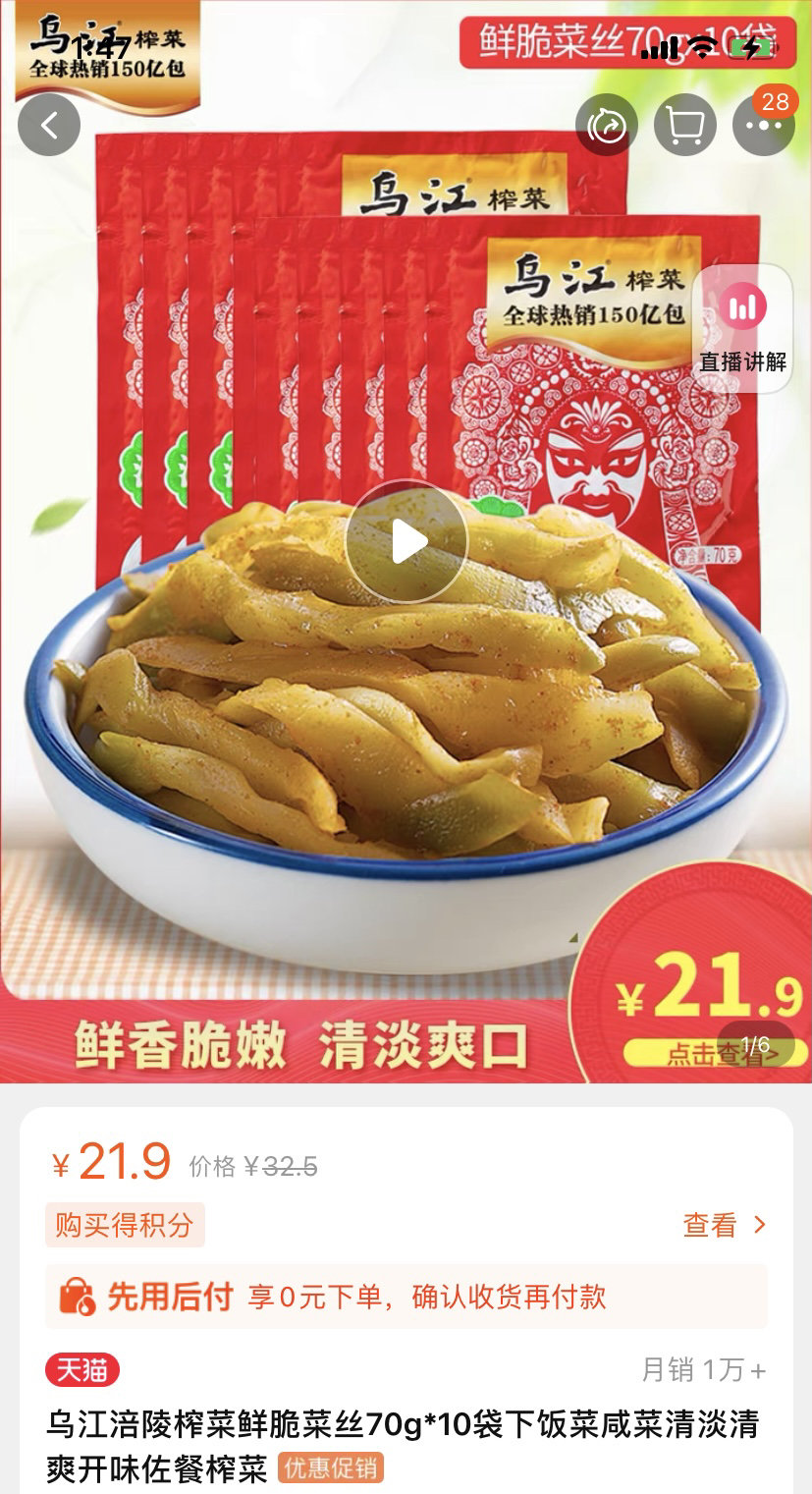 大众款榨菜情况如何?在淘宝“乌江旗舰店”,仍然有几款榨菜在做“限时折扣”“下单5折”的活动。一款70g规格的“乌江涪陵榨菜鲜脆菜丝”价格显示每袋2.19元,而在之前,这款榨菜的售价是每袋2元。店铺客服表示,“确实涨价了。”