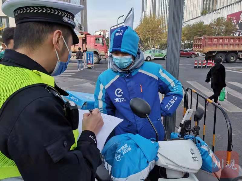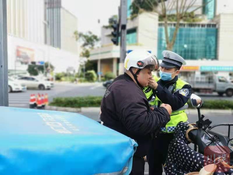 现场纠正未戴安全头盔的外卖快递小哥,交警登记骑手姓名、所属平台等信息。