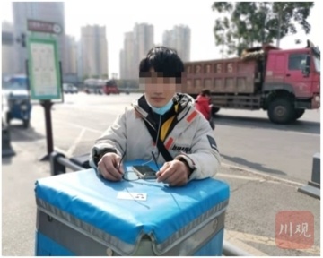 令狐某元,饿了么骑手,未佩戴安全头盔,所属配送站点:锦江区饿了么锦江万达配送站。