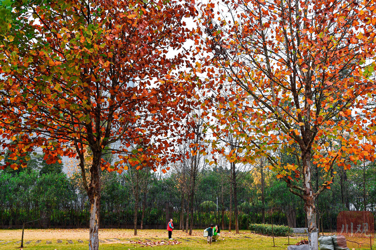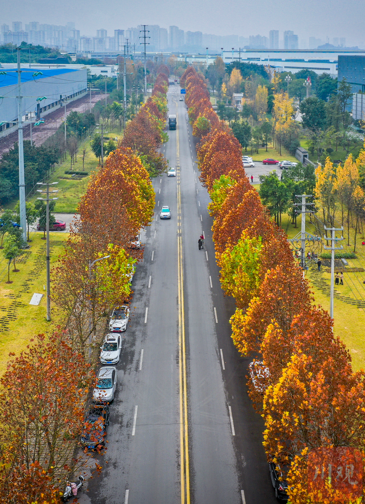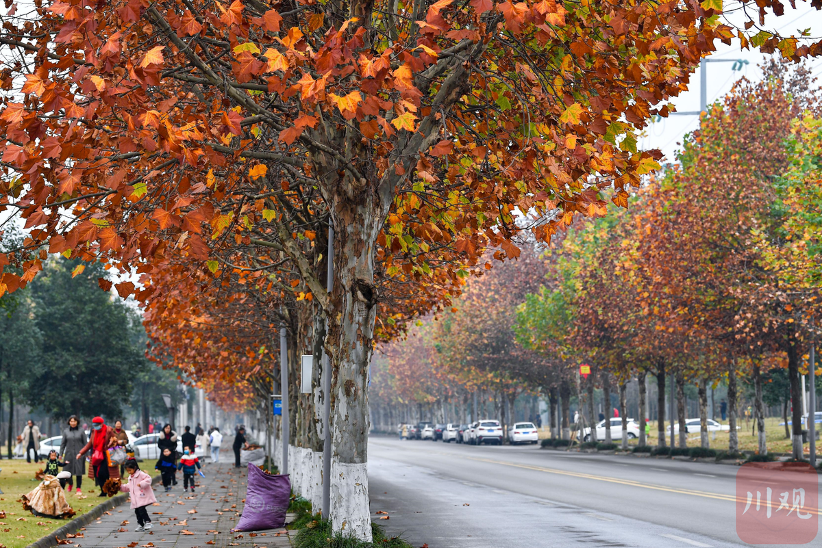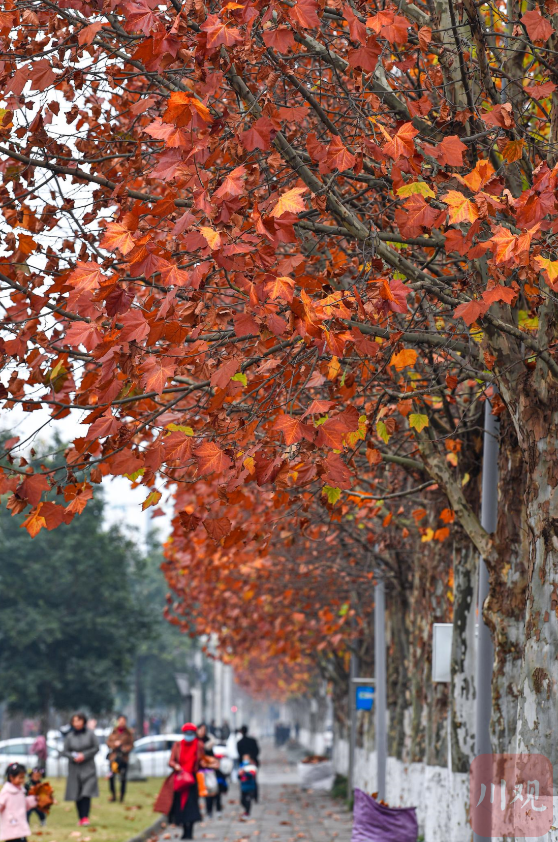 11月29日,自贡市板仓工业园区内一条长约3公里的道路两旁种植着许多梧桐树,进入冬季后树叶变成红黄色,让整条大道呈现出五彩斑斓的颜色。人行道上已落叶铺地,美景吸引了众多市民前来打卡拍照。