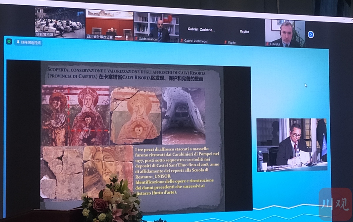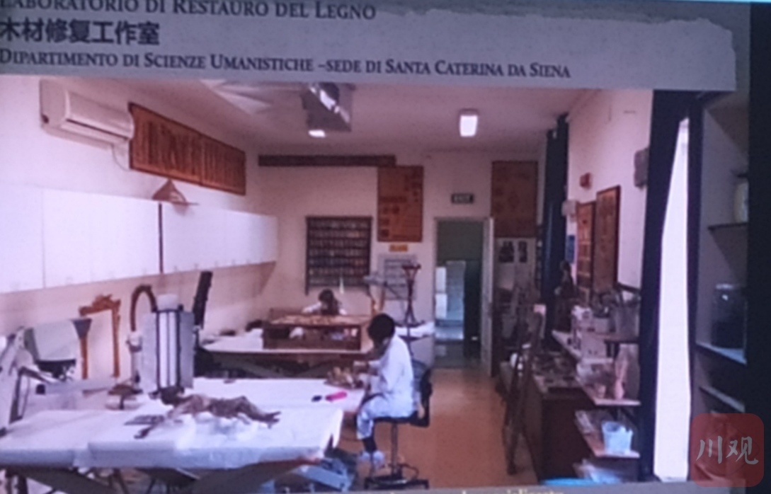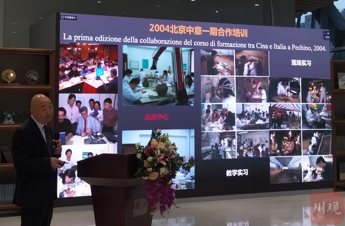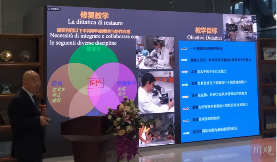 29日,“四川省-坎帕尼亚大区文化遗产保护利用学术研讨会”上,詹长法与那不勒斯贝宁卡萨大学考古修复学院院长帕斯卡尔·罗西(Pasquale Rossi)展开一场对话,后者介绍了意大利文物修复师的培养体系。
