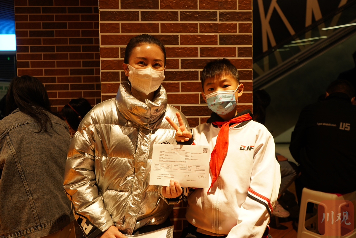成都高新区润莱·金座点位,成都教科院附属学校(东区)五(二)班的一名学生家长张石磊和孩子共同晒出接种凭证。魏冯摄。