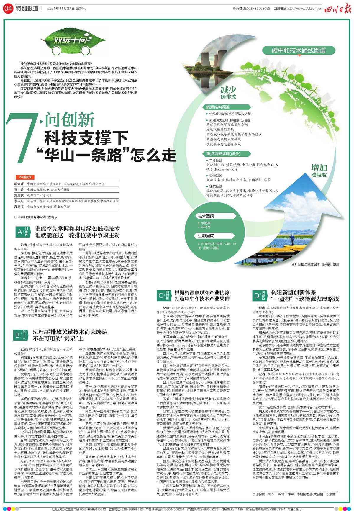 中国工程院院士、四川大学教授石碧,还有另外一个身份:全国首个省级碳中和技术创新中心主任,他透露,中心正瞄准四川省新兴产业培育与传统产业转型升级的重大需求,在努力突破“碳减排”“碳零排”“碳负排”关键核心技术瓶颈,为全国实现碳中和目标提供技术支撑。