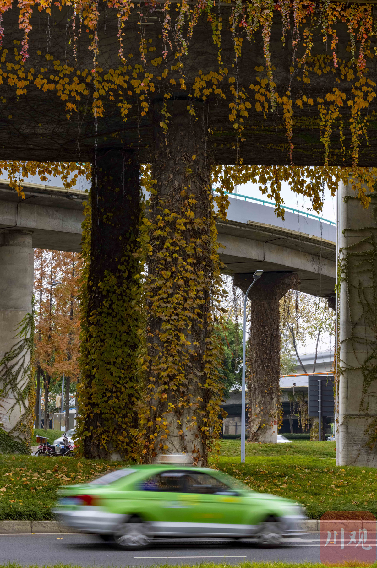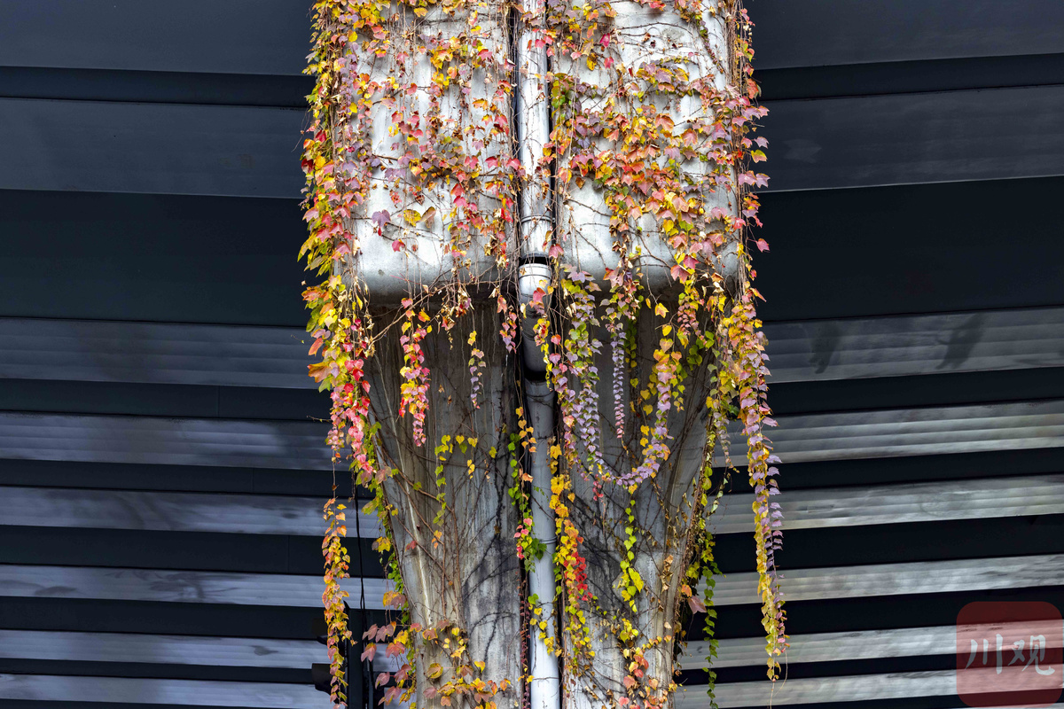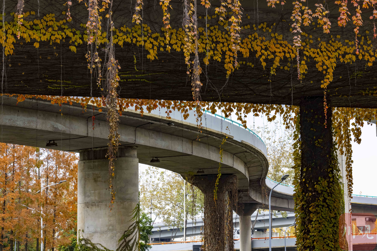 初冬,成都二环路高架桥桥墩上面攀附的被称为“爬山虎”的绿藤,从夏秋季节的绿野仙踪般的童话世界,逐渐变成了重彩水墨的国画意境,让冷冰冰钢筋水泥桥墩显得更有生机,摇曳生姿的红叶看醉了过往的行人。