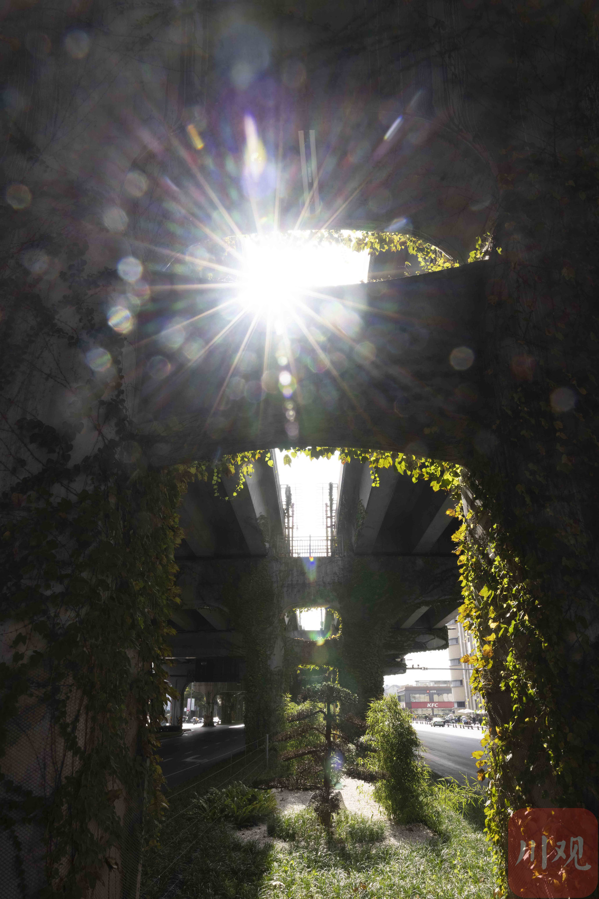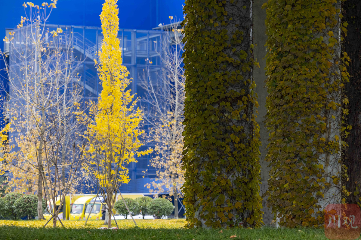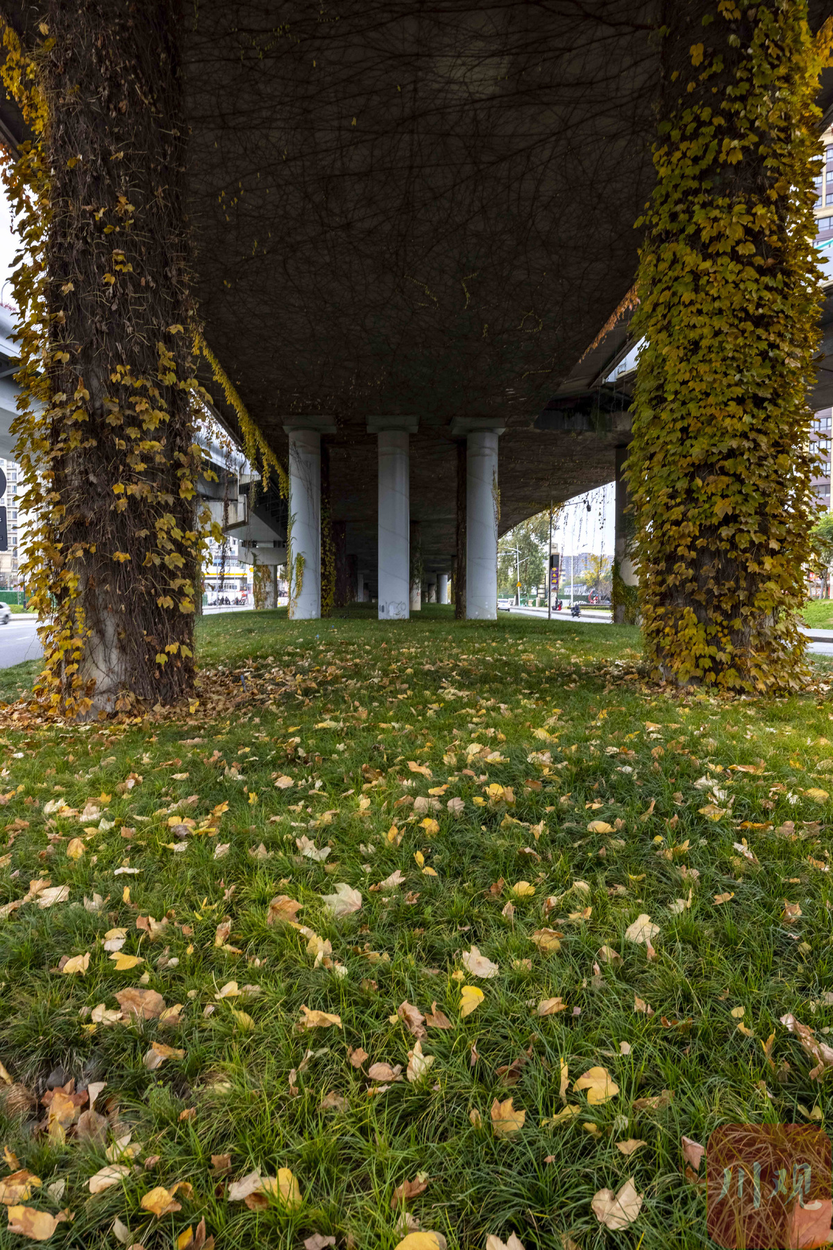初冬,成都二环路高架桥桥墩上面攀附的被称为“爬山虎”的绿藤,从夏秋季节的绿野仙踪般的童话世界,逐渐变成了重彩水墨的国画意境,让冷冰冰钢筋水泥桥墩显得更有生机,摇曳生姿的红叶看醉了过往的行人。