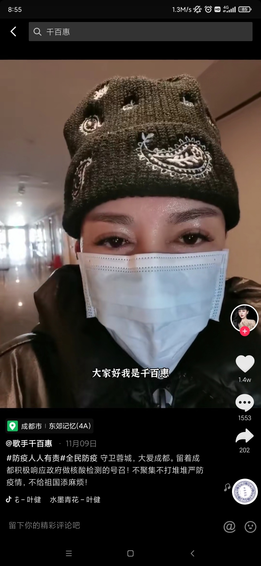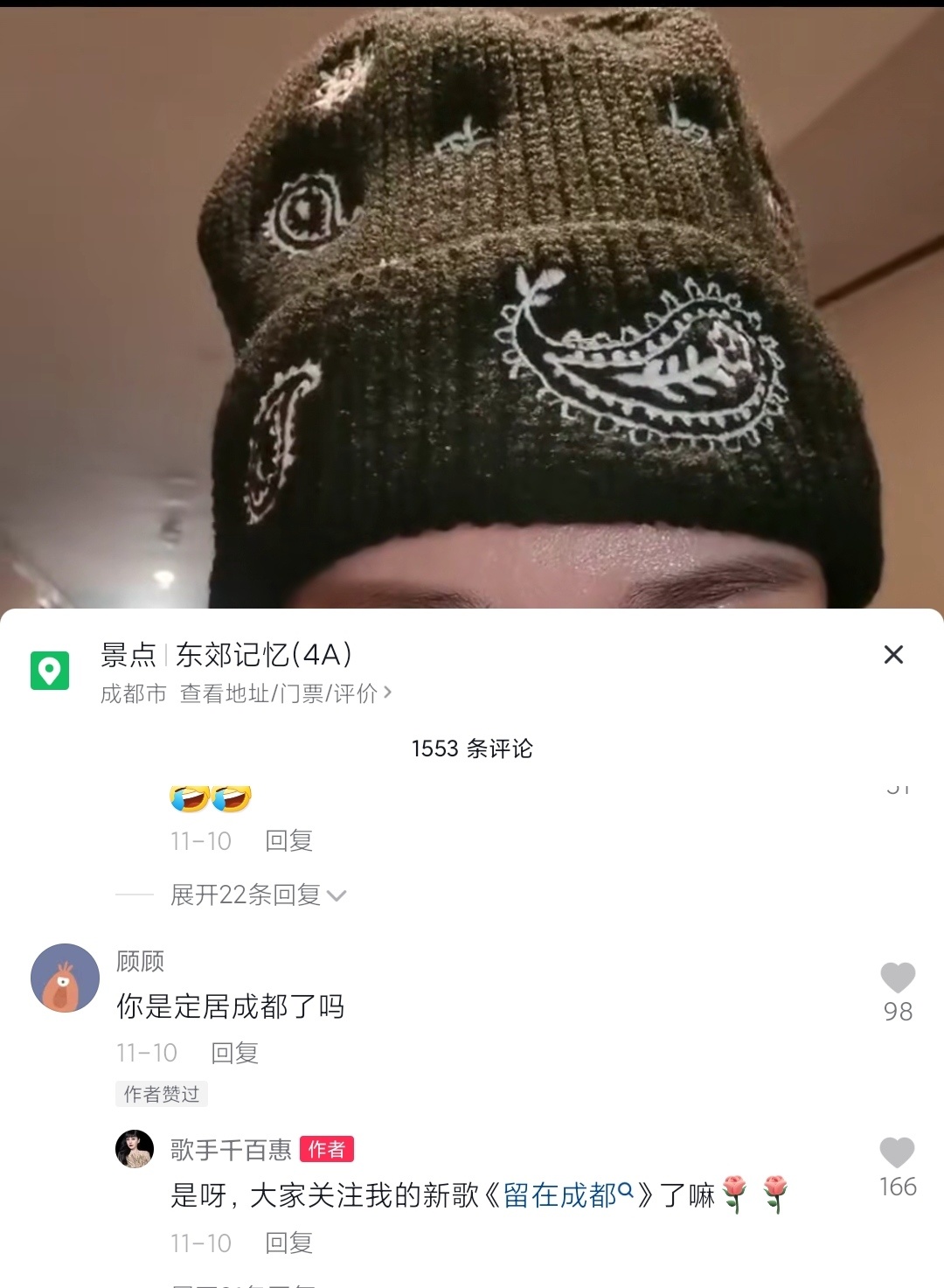很快,眼尖的网友发现,她晒身份证的地点有些像宽窄巷子。同时在该社交账号上,千百惠在11月8日成都疫情封控时,在东郊记忆戴上口罩排队参加核酸检测。有网友发问:“你是定居成都了吗?”她也爽快地回答:“是呀,大家关注我的新歌《留在成都》。”