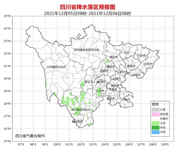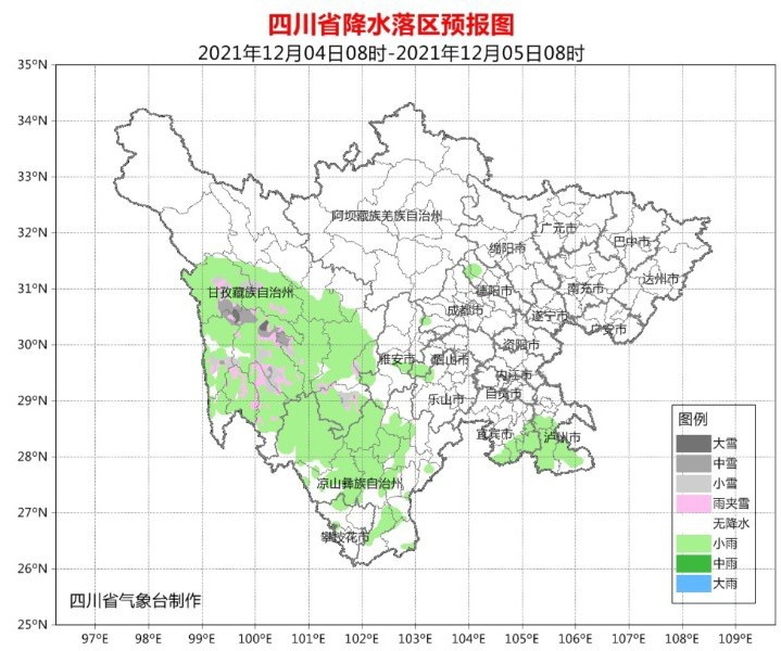 今天晚上,盆地大部晴间多云,其中雅安、宜宾、泸州3市南部阴天有小雨或零星小雨;甘孜州中部南部多云有阵雪(雨),川西高原其余地方晴;攀西地区多云间阴,其中凉山州北部有分散阵雨。