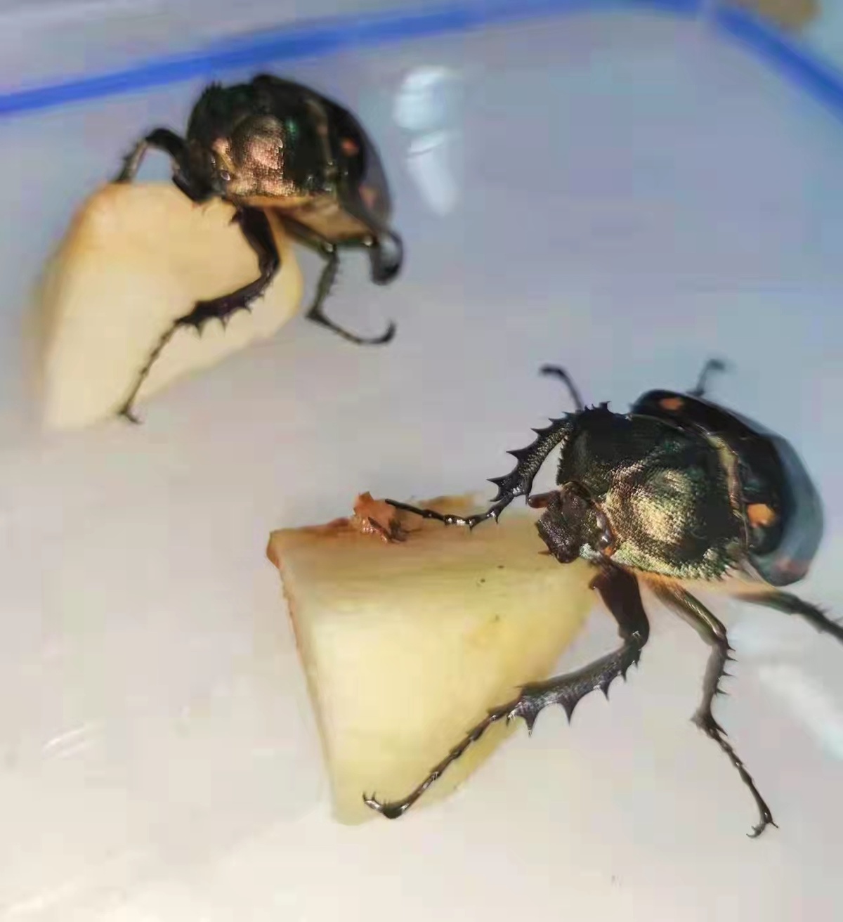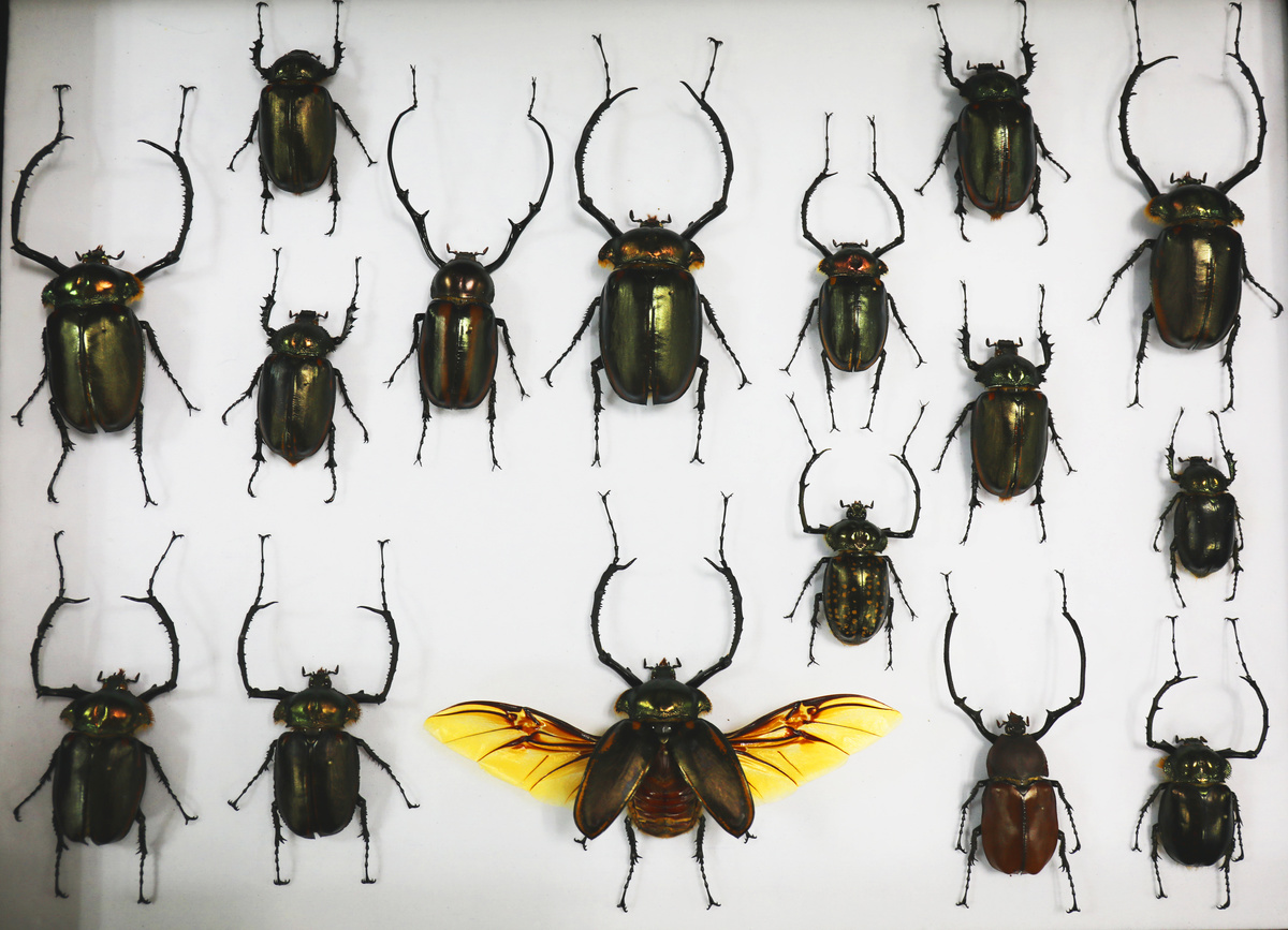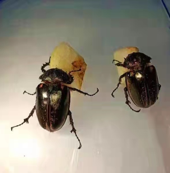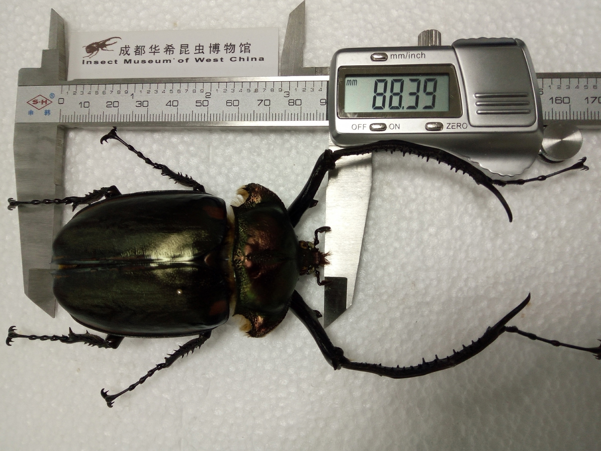 赵力告诉记者,阳彩臂金龟不仅是中国最大的甲虫种类,还是世界上最大的长臂金龟属种类。“过去认为世界最大该属种类,是生活在印度尼西亚的茶色长臂金龟,最大个体体长达到8.5cm。不过,我馆多年前曾经收集到一只体长8.8cm的个体,证明了中国的阳彩臂金龟才是世界上最大的长臂金龟属种类。”