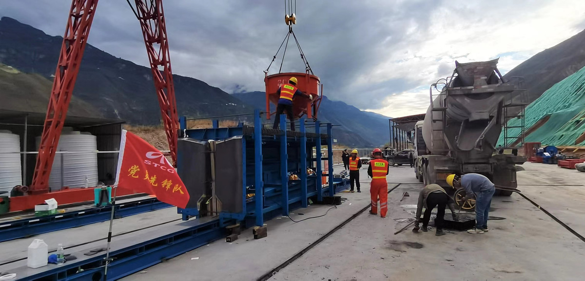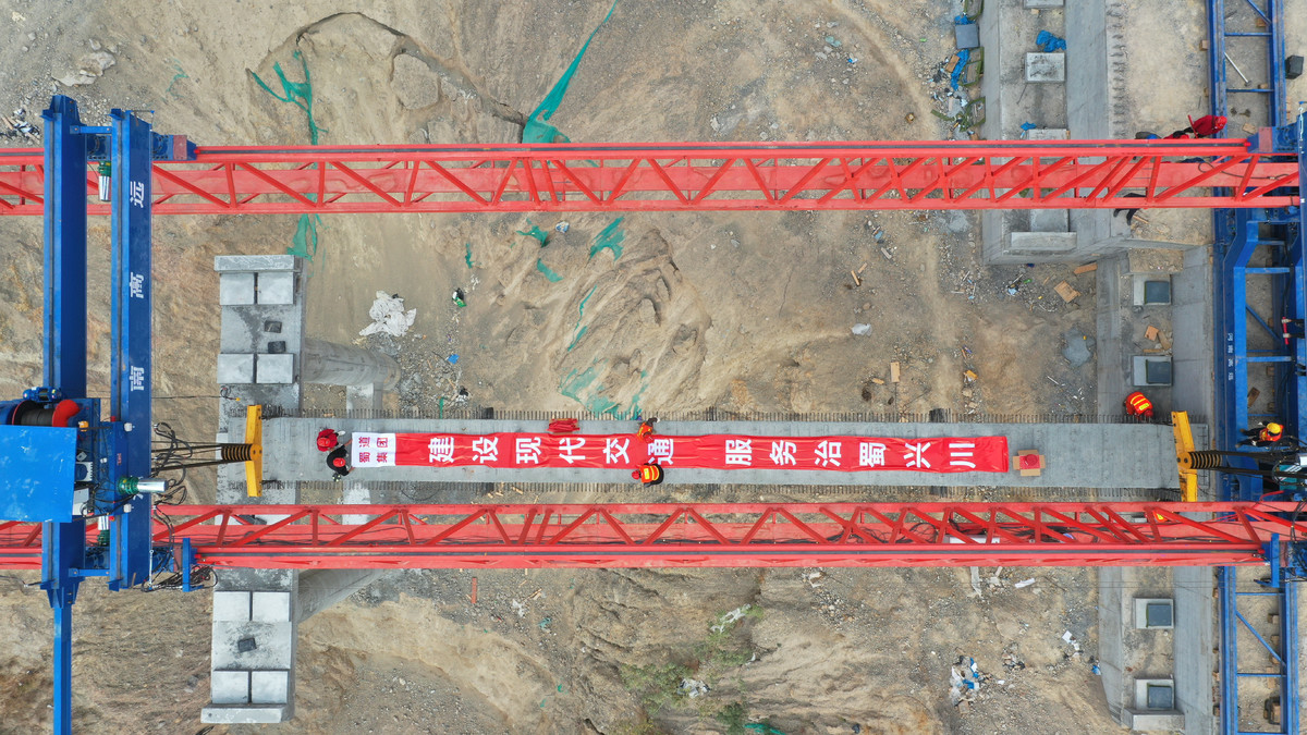 德溪1号大桥位于金阳县德溪镇,段内桥梁共计15座,预制T梁共计580片,本次架设T梁为德溪1号大桥左幅1-4号梁板,梁长25米。为保证首片预制T梁顺利架设,蜀道集团沿江宜金公司组织各参建单位不断优化施工方案,克服地理环境恶劣、大型梁运输困难、安全环保压力大等困难,确保了架设过程安全有序进行,为后续大面积架梁施工奠定了良好的基础。