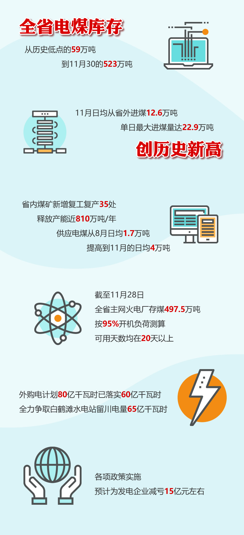 截至11月28日,全省主网火电厂存煤497.5万吨,按95%开机负荷测算,可用天数均在20天以上。