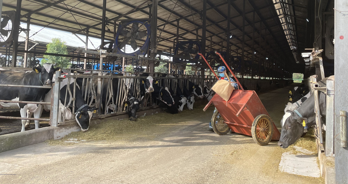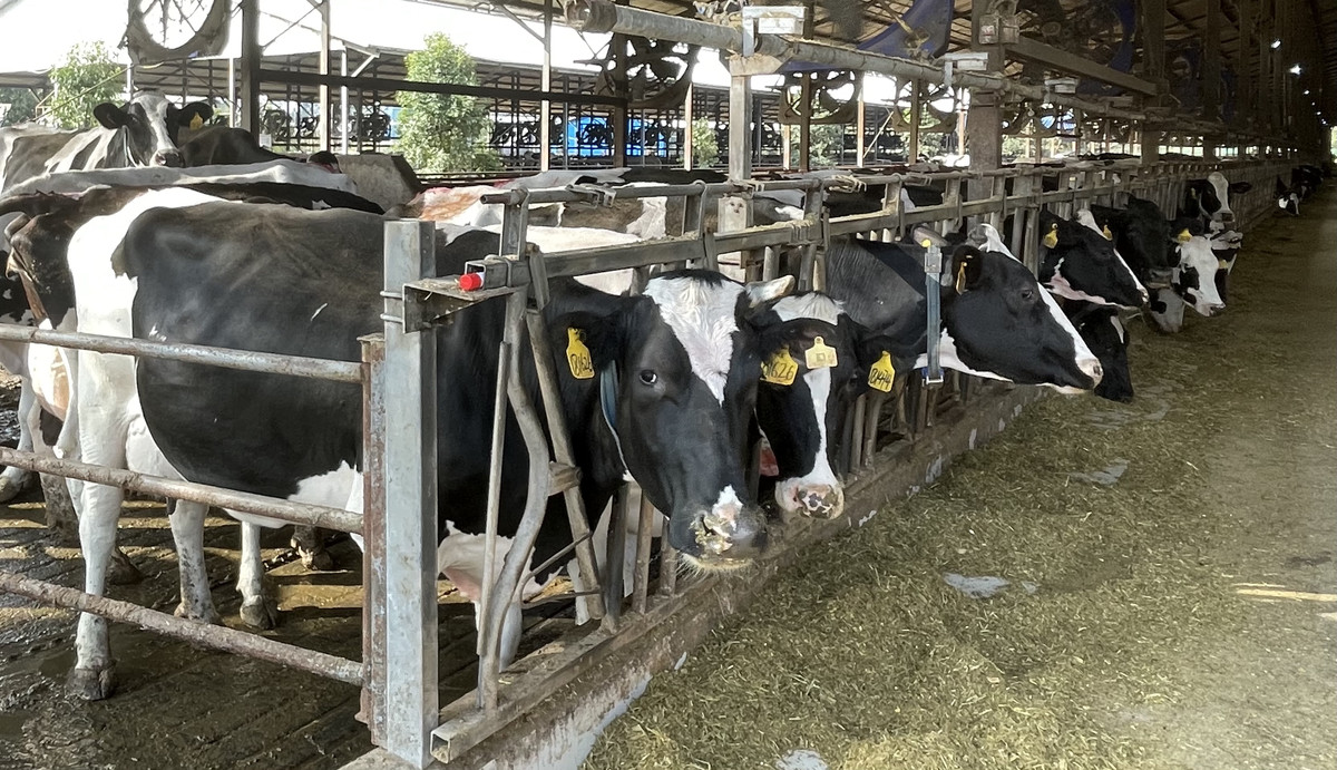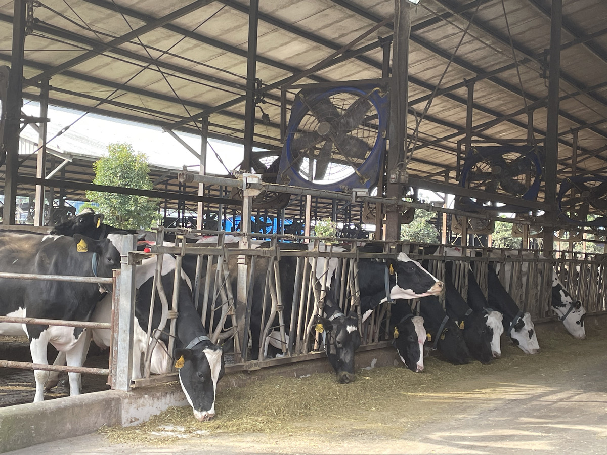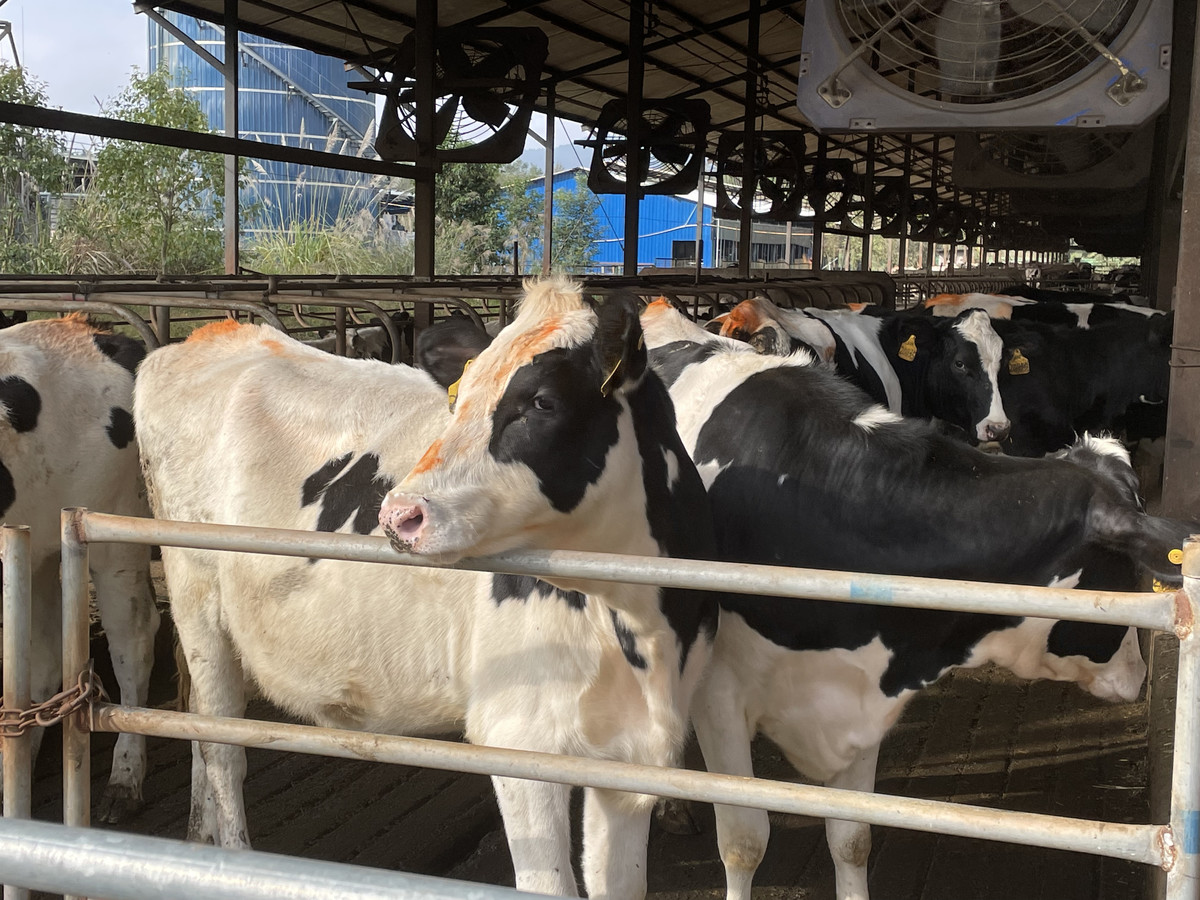 张广平坦言,南方养殖奶牛在防暑降温、饲草方面面临更高的成本。他抬起手臂伸出手指,把记者的目光引向养殖棚里正快速转动的风扇,“今天气温略为偏高,所以打开风扇来给奶牛环境降温。”