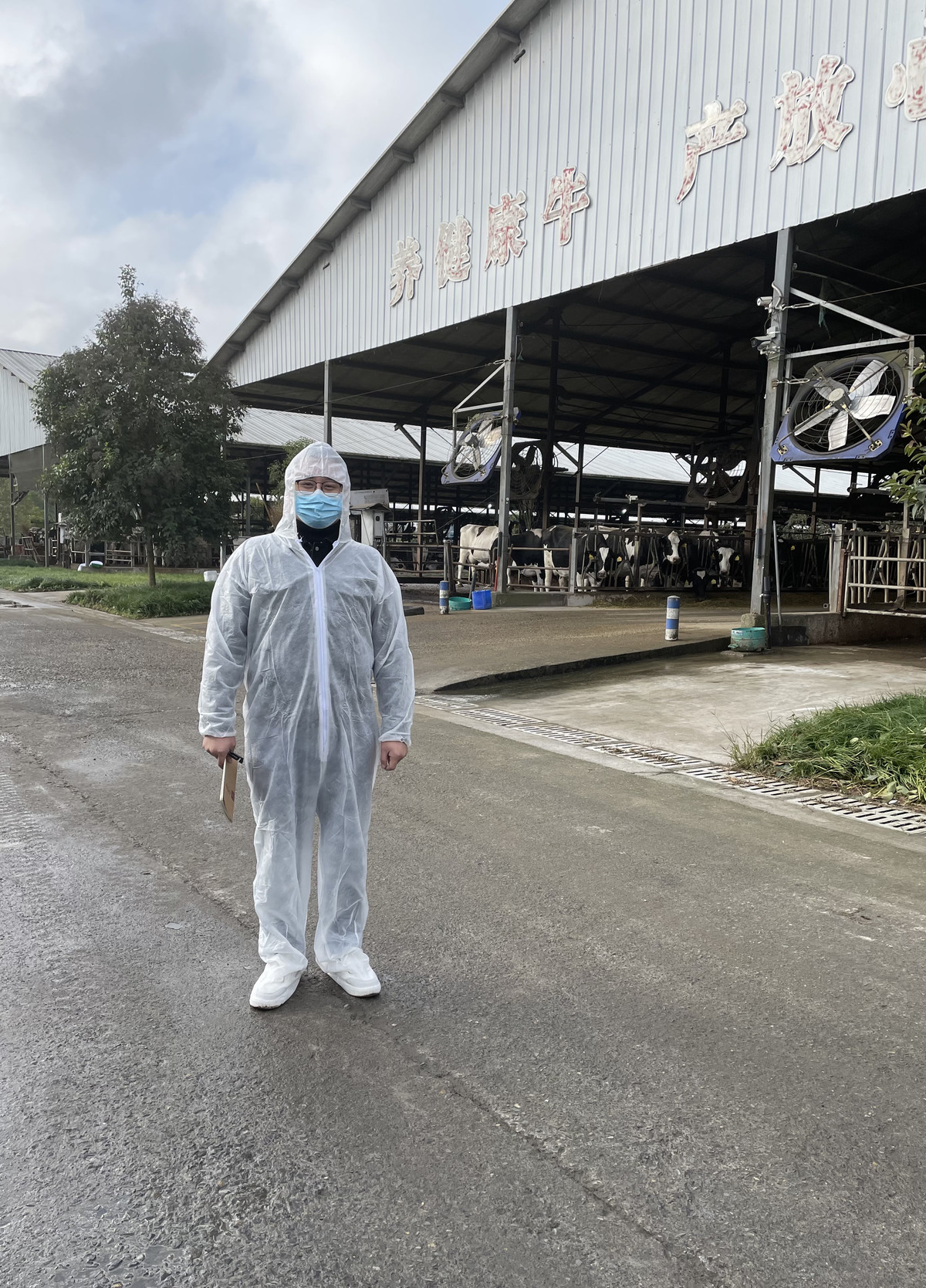 进入奶牛场,除做完疫情防控要求的项目外,还需穿上从头到脚均能严实包裹的隔离服,再踏过氢氧化钠溶液等配兑的消毒池。