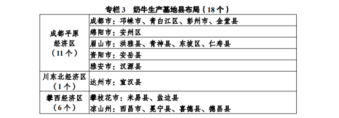 2020年7月,四川省委农村工作领导小组印发《川牛羊(畜禽饲草)产业振兴工作推进方案》,根据各地资源禀赋、自然条件,结合现有产业基础,布局发展18个奶牛产业基地县。