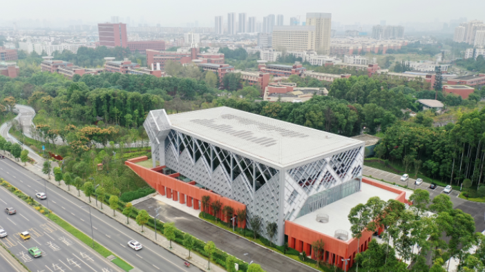 大运村(产教融合)建设项目中,3号运动员公寓,是项目中单体面积最大的新建建筑,共15层,将为大运会运动员和教练员提供1847间宿舍;生活服务中心900座大剧场,具备长度达24米,高度达8.1米可升降上翻门,控制剧场内外连接,是目前西南地区最具特色的高校剧场之一。