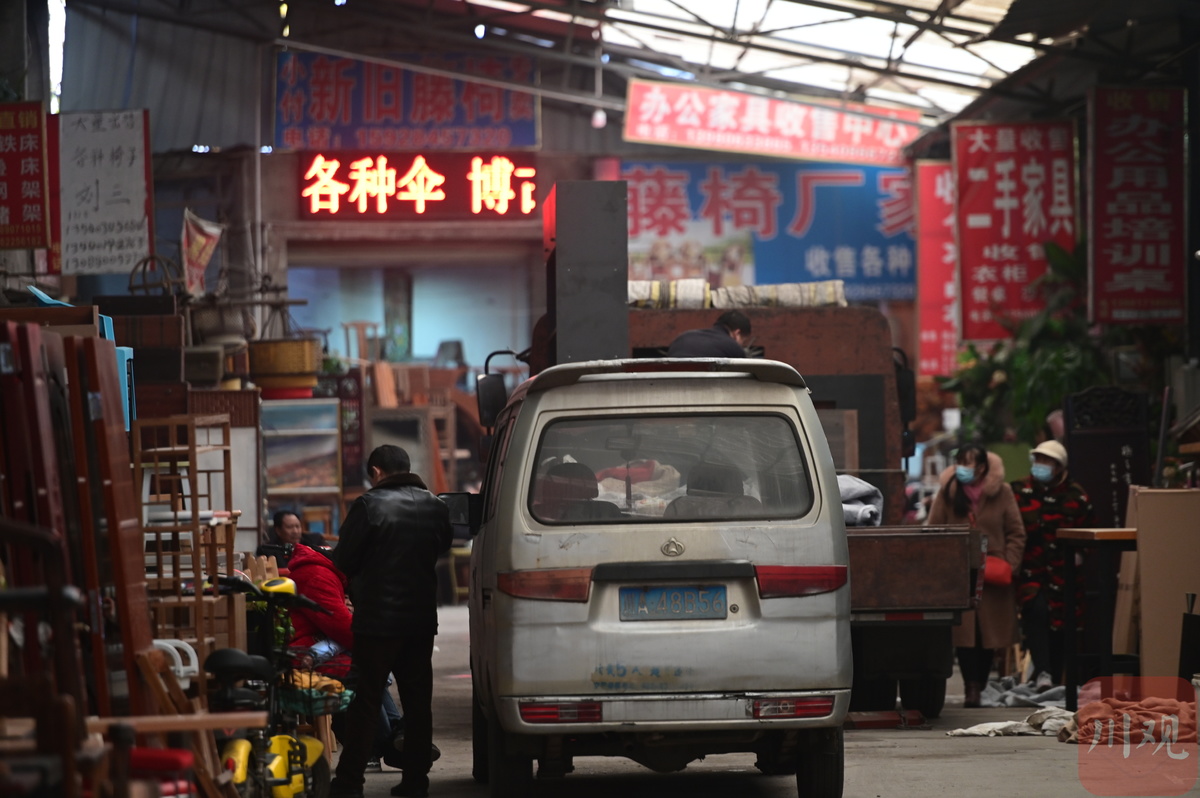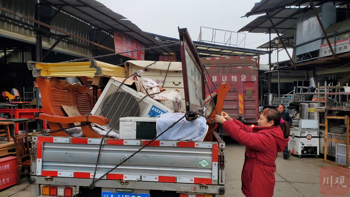 陈大姐两夫妻一大早就到市场里淘了不少好东西,“今天买了10多张椅子,2个空调,一套沙发,几扇门,还有乱七八糟一堆小东西,才花了2000多块钱,很划算。”收获颇丰的陈大姐心情很好,一边和老公将自家的小货车装的满满当当,一边和记者拉起了家常。陈大姐是大英县人,老家的房子刚刚翻新完,这一车东西就是带给家用的。“一会儿就拉回去,正好明天还能喝上朋友家的喜酒。”