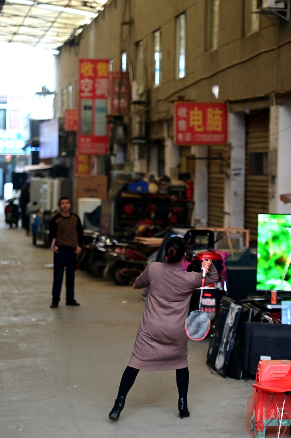 店主们趁着空闲在市场内打起了羽毛球。