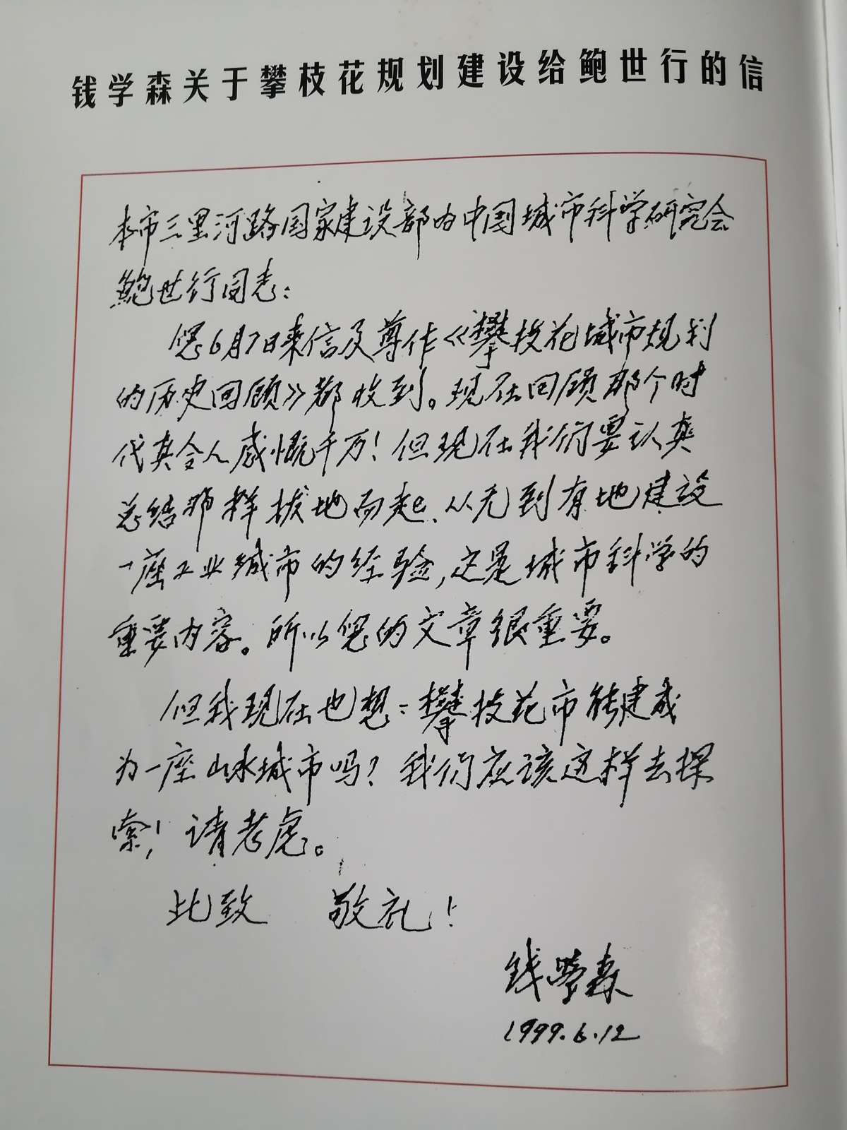 您6月7日来信及尊作《攀枝花城市规划的历史回顾》都收到。现在回顾那个时代真令人感慨千万!但现在我们要认真总结那样拔地而起,从无到有地建设一座城市的经验,这是城市科学的重要内容。所以您的文章很重要。