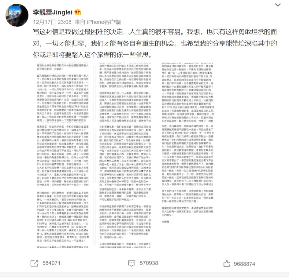 近日,著名歌手王力宏宣布离婚。12月17日晚11时,王力宏前妻李靓蕾发文,称王力宏在婚姻存续期间存在行为不端,表示夫妻俩除了在经济上存在诸多矛盾,还爆出王力宏婚内期间有出轨的现象。