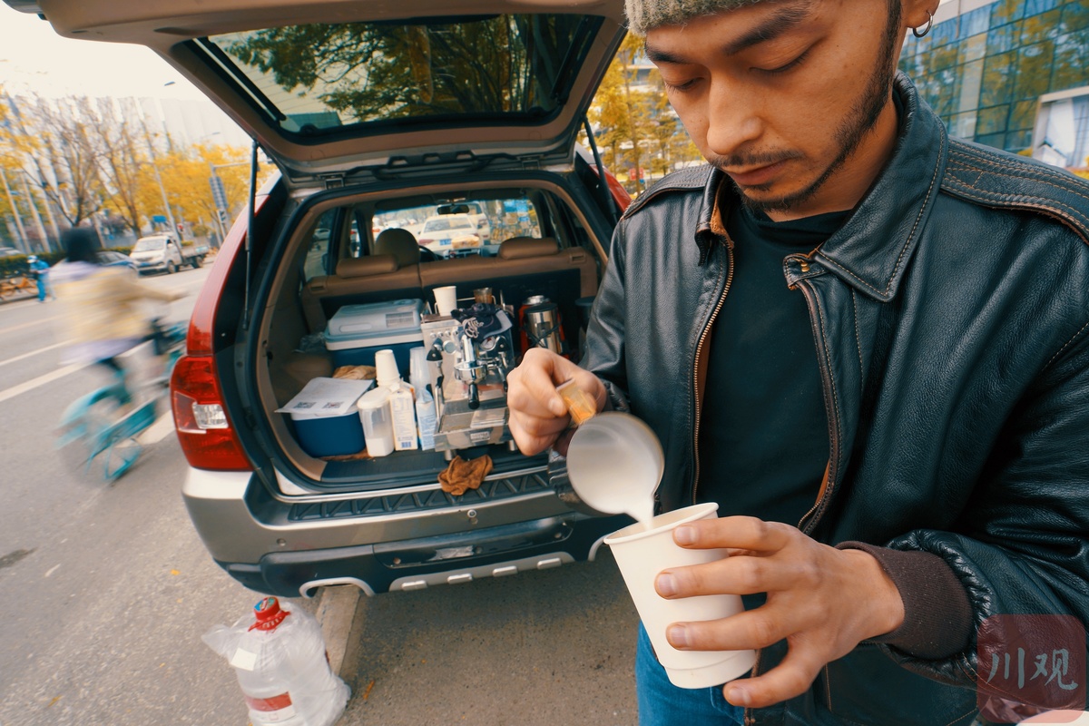 3月25日,咖啡车从业者刘博文在成都大悦城外面的街道上调制咖啡。