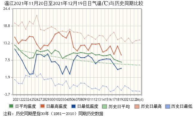 要问现在的气温处于什么状态?我们以国家气候基准站温江站为例:12月4日以来,温江站的日平均气温一直高于历史同期——虽然总体趋势向下,但相较常年同期来说,还偏暖和呢~