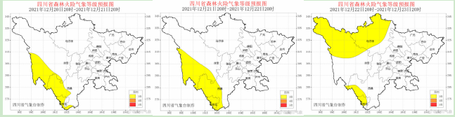 据最新气象资料分析:12月21~22日,川西高原和攀西地区大部多云间晴,预计甘孜州南部、攀西地区西部南部的森林火险气象等级为3级;23日川西高原北部多云间晴,川西高原南部及攀西地区阴天间多云有阵雨(雪),其中凉山州南部局部地方有中雨,预计川西高原北部和攀西地区西部森林火险气象等级为3级。