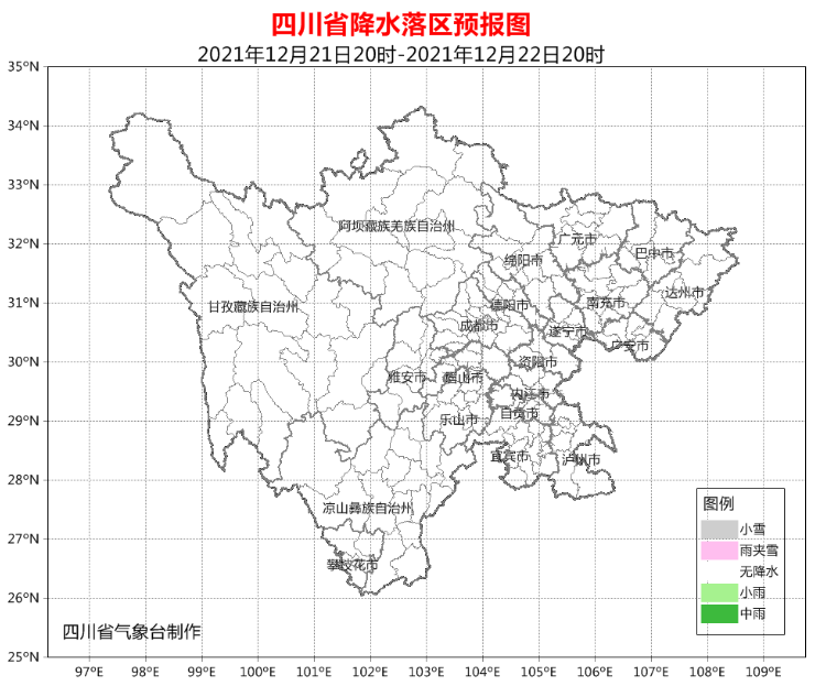 预计22日晚上到23日白天,盆地大部阴天,其中广元、巴中、达州、南充、广安、泸州、雅安7市及遂宁、资阳、内江、自贡4市东部及盆地西部南部沿山有小雨或零星小雨;川西高原北部多云间晴,南部阴天间多云有阵雨(雪);攀西地区北部阴天间多云,南部阴天有阵雨。