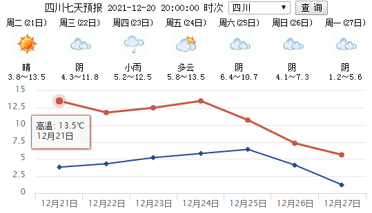 不过,个人觉得本周气温比较给力。目前,四川省气象台预测的每一天的全省平均最高气温都站在10℃以上。12~13℃的日最高气温,让人感觉得到一丝暖意……