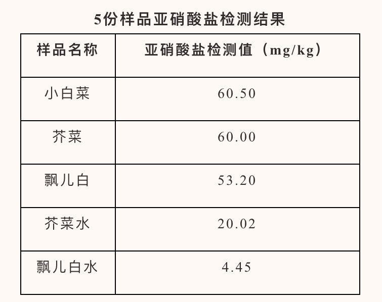 接下来,成都疾控工作人员把每种蔬菜分装成的4份样品中的其中两份放冰箱储存(一份为仅蔬菜水,另一份为含蔬菜的蔬菜水),另外两份放室温。一天后,接着检测16份样品中的亚硝酸盐含量,结果惊讶地发现:放置在室温保存的8份样品中,有5份样品检出了亚硝酸盐,而且有的样品检测值还很高,最高达到60.50mg/kg。而储存在冰箱的8份蔬菜或蔬菜水都没有检出亚硝酸盐。