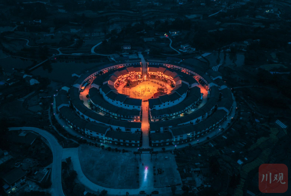 3月15日,从空中俯瞰自贡市荣县留佳镇龙凤新村,神似大鱼海棠土楼造型的新村格外漂亮。