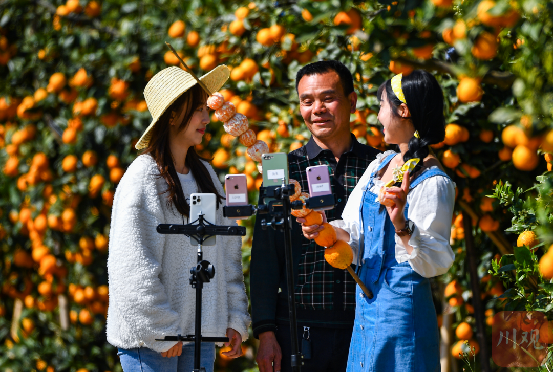 3月23日,雅安市汉源县安乐乡拉来村,平台主播陈潇潇在一片黄果柑林里与村上的书记一起直播带货,助力乡村振兴发展。