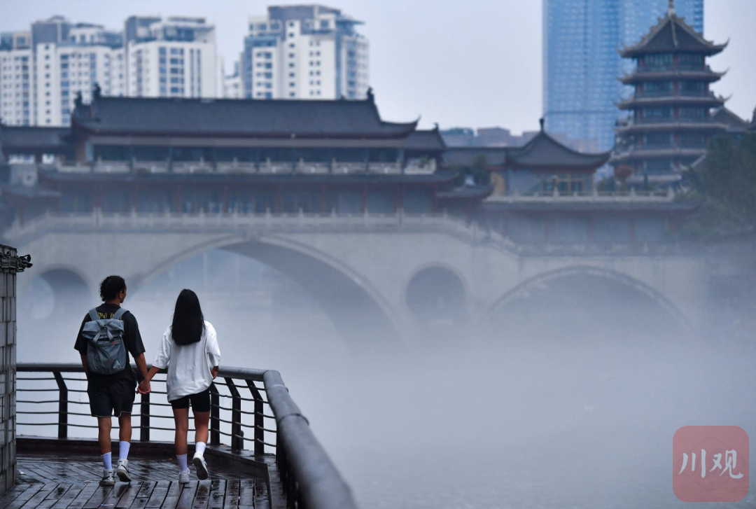6月15日清晨,一对年轻人走在合江亭边观赏锦江上出现的薄雾。