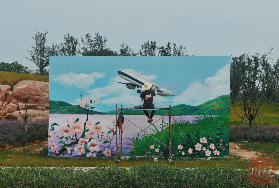 6月23日,成都东部新区,一位美工在路边的墙上画装饰画。再过几天,成都天府国际机场将正式投用。