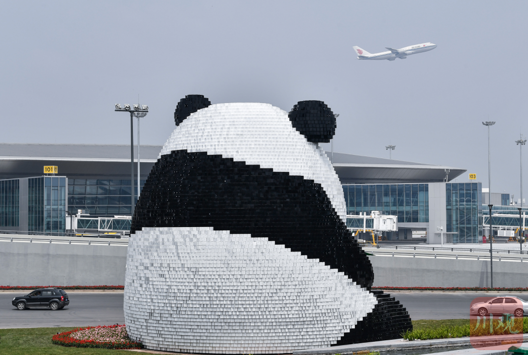 6月27日,一架国航飞机从成都天府国际机场的大熊猫雕塑“团团”前飞过,当日新机场正式启用。