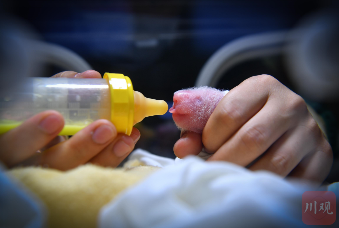 7月17日,阿坝州汶川县,中国大熊猫保护研究中心神树坪基地,工作人员正在给刚出生的大熊猫幼崽喂奶。当日,两胎四崽大熊猫1小时内相继在基地出生,创造了神树坪基地人工繁育大熊猫的新纪录。