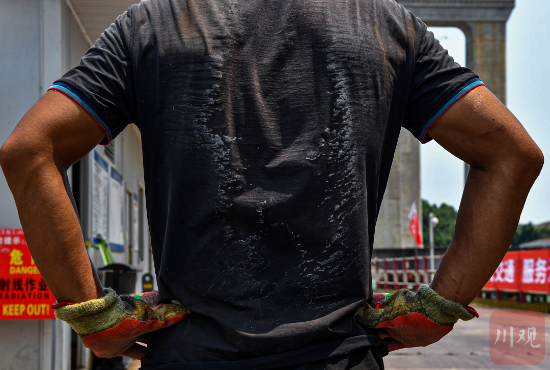 8月6日,宜宾市公铁两用斜拉桥建设现场,工人衣服上的盐渍清晰可见,这时的室外温度已经超过40 ℃。