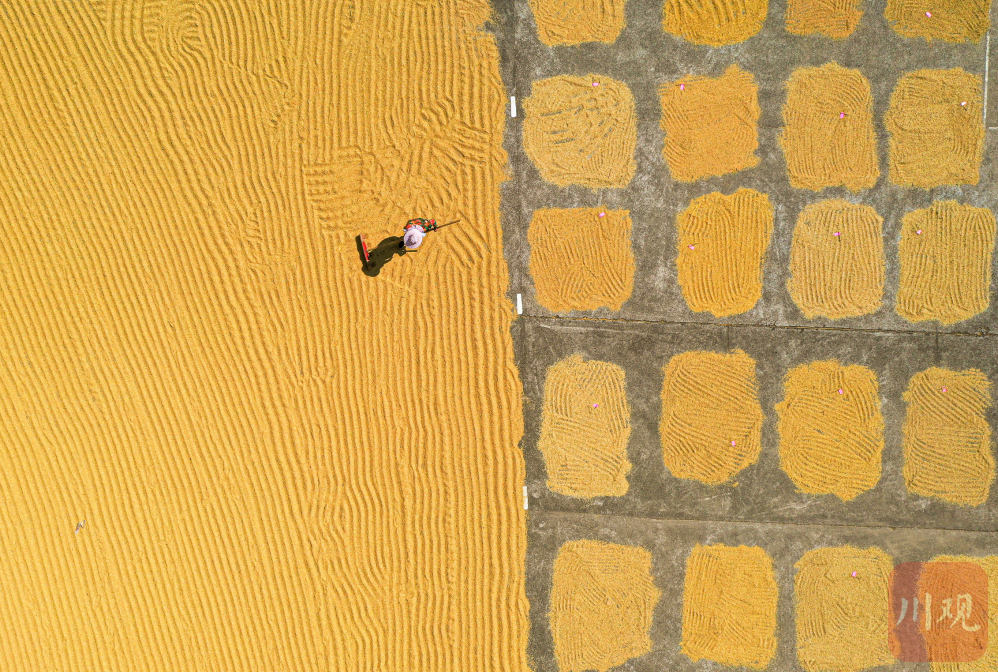8月19日,四川省农业科学院水稻高粱研究所泸县科研基地内,工作人员正在晾晒收割下的水稻组合。院坝中,一个一个的小方块整齐排列,这些小方块就是今年新水稻组合。