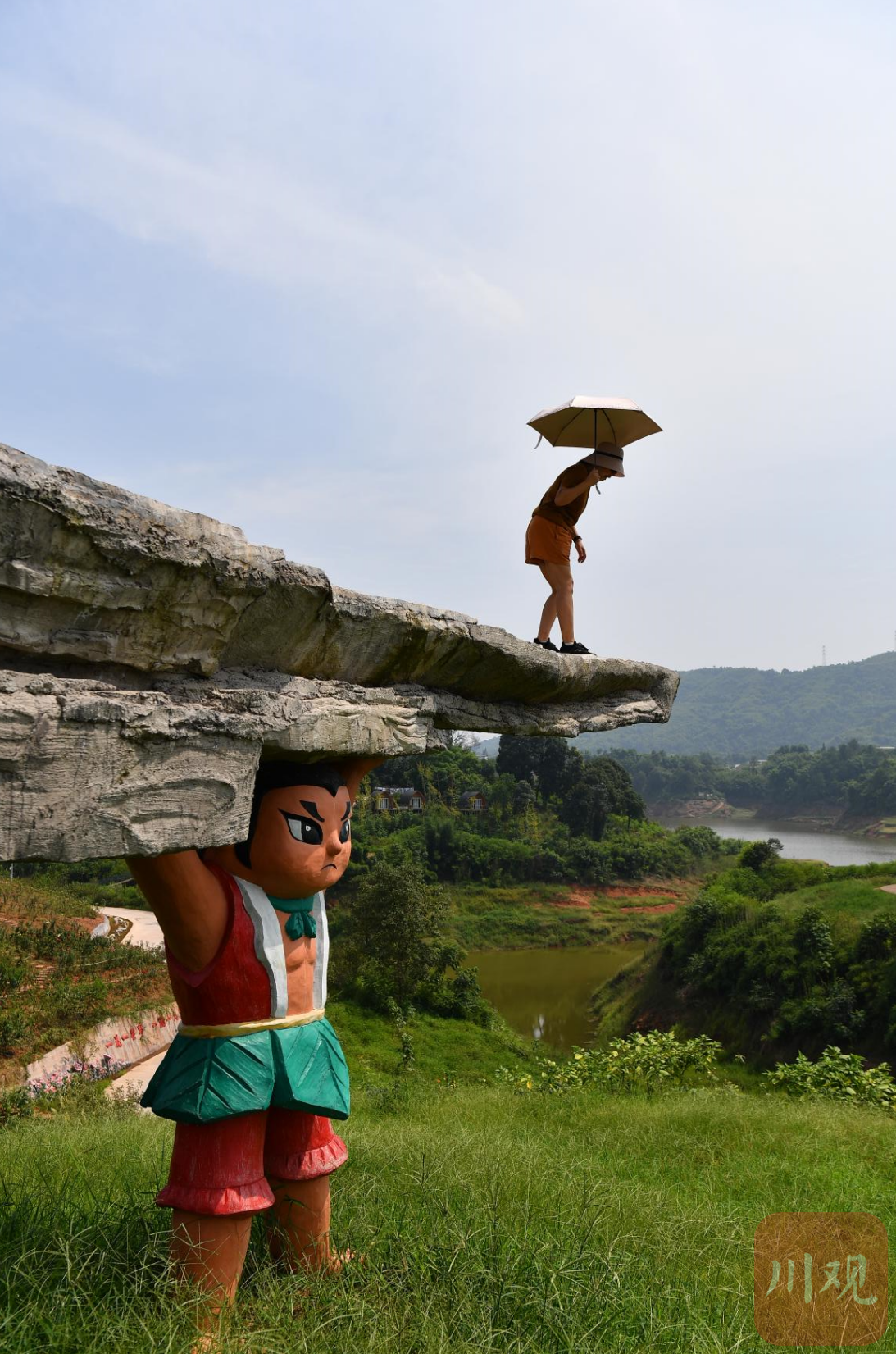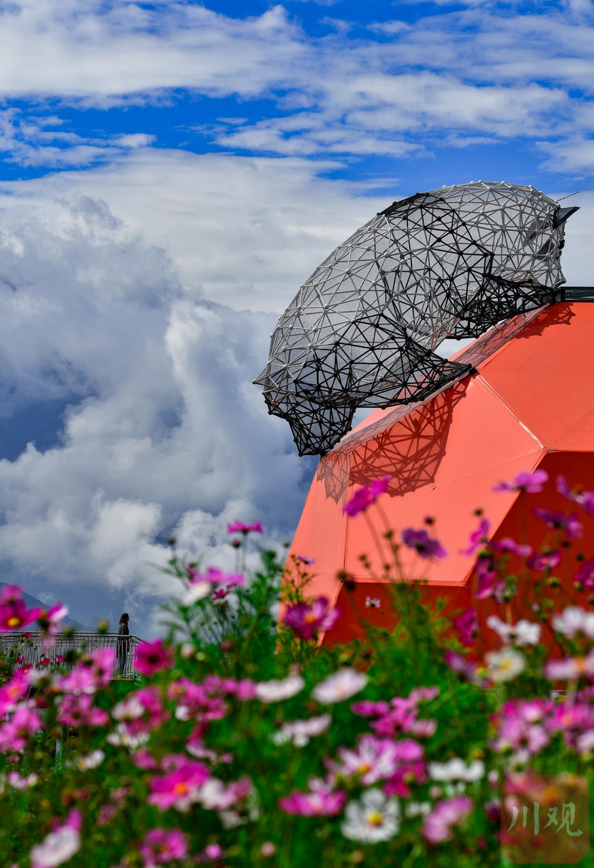 9月2日,阿坝州汶川县“花果山”观景台,一只可爱的熊猫雕塑“趴”在橘色的球体上,这里已经成为乡村振兴的新景点。
