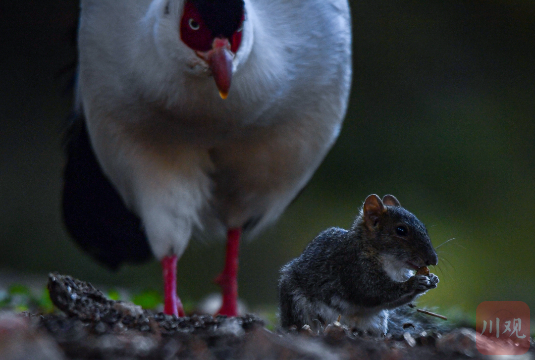 10月12日,甘孜州稻城县,一只可爱的松鼠正在偷吃白马鸡的食物。