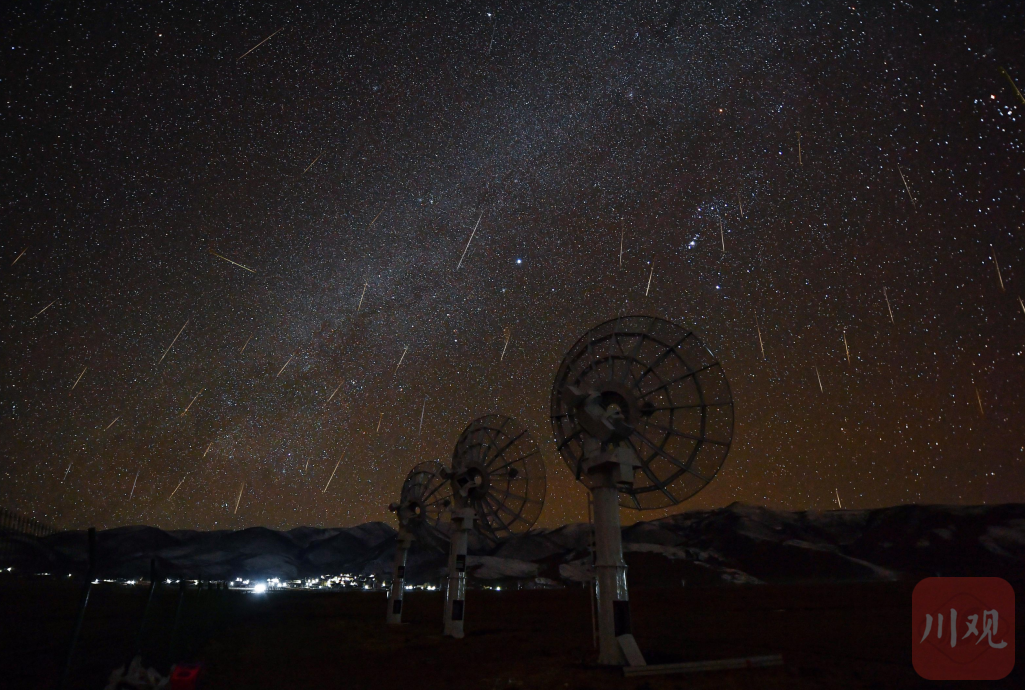 12月14日凌晨4点,甘孜州稻城县,双子座流星雨从圆环阵太阳射电成像望远镜的天线上空划过,2个多小时的时间里相机捕捉了60多颗流星。