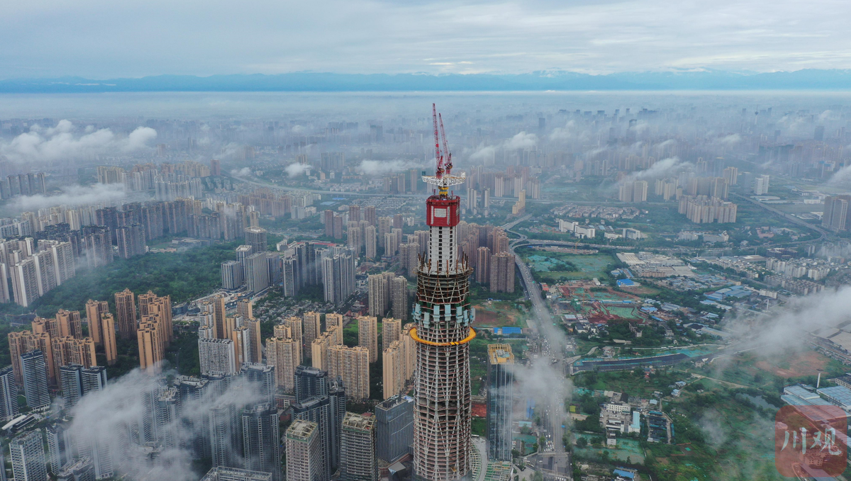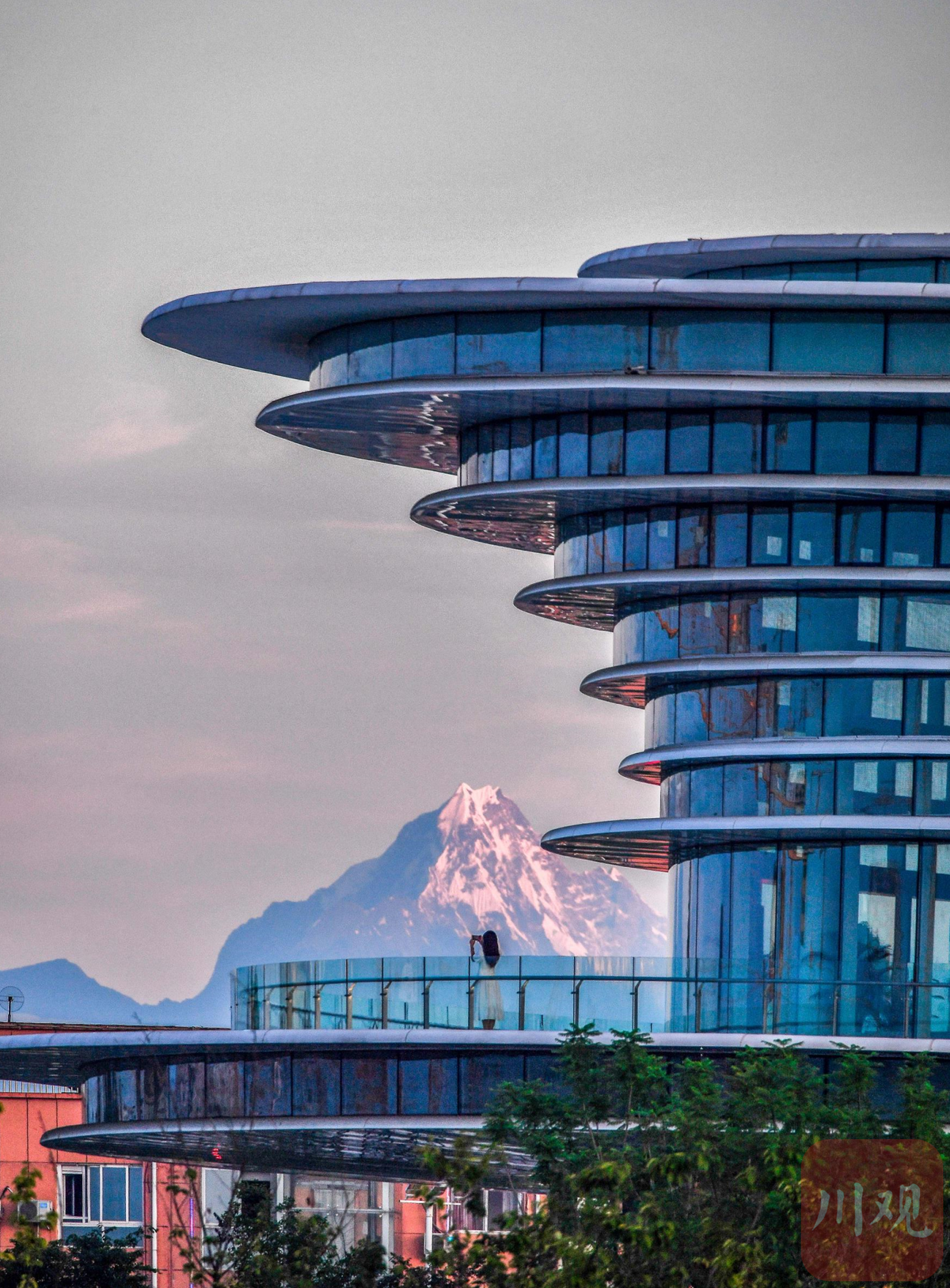 8月23日清晨,成都市双流区,幺妹峰出现在空港·云的城市新地标前,雪山与现代建筑相映成趣。