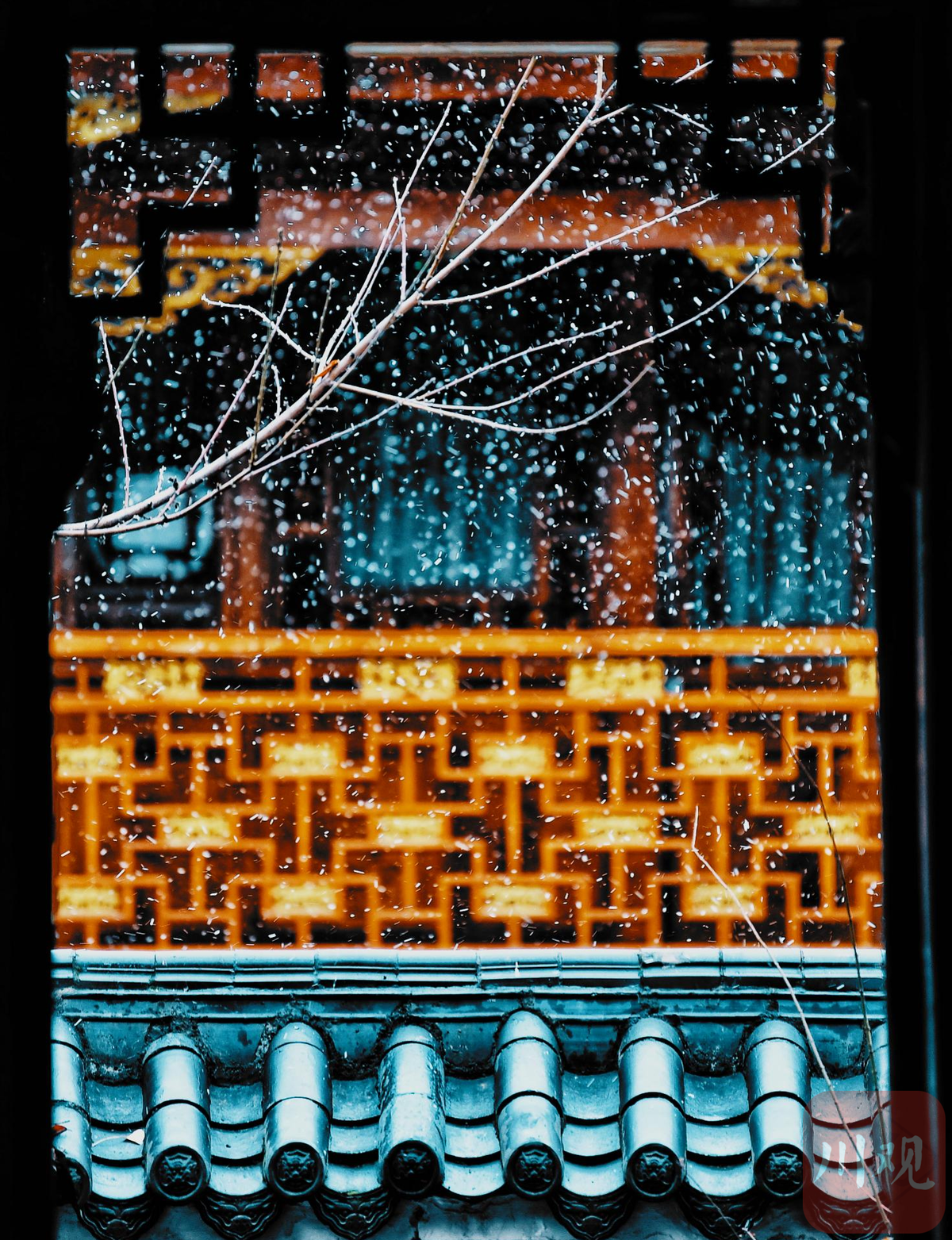 1月7日,雪花在成都大慈寺古建筑上纷飞,一场强降温给成都市区带来降雪。