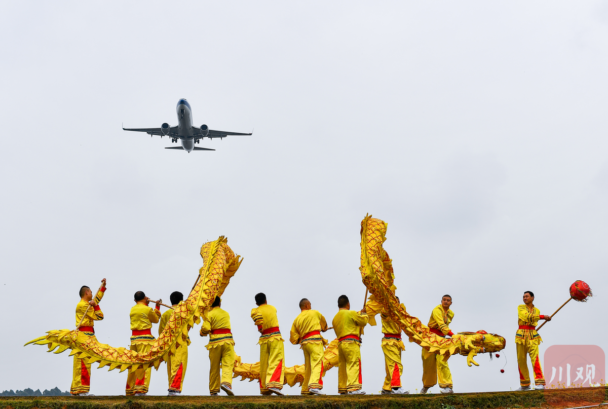 3月9日,“二月二,龙抬头”前夕,成都双流区的黄龙溪火龙灯在空港花田中舞起来,准备降落在双流机场的飞机刚好从队伍上空飞过。