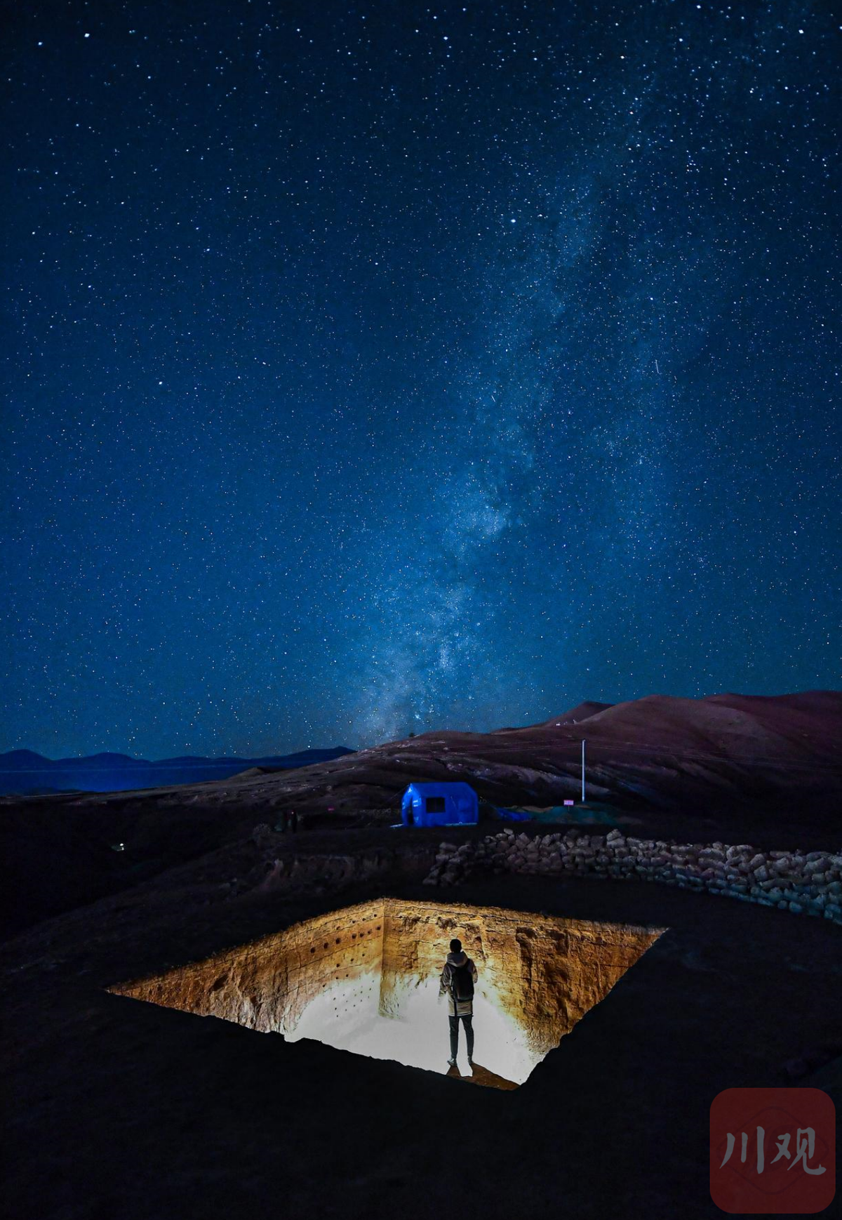 10月27日晚,甘孜州稻城县,工作人员守候在皮洛遗址发掘现场。在同一银河下,现代考古和旧石器时代的遗迹在这里交汇。