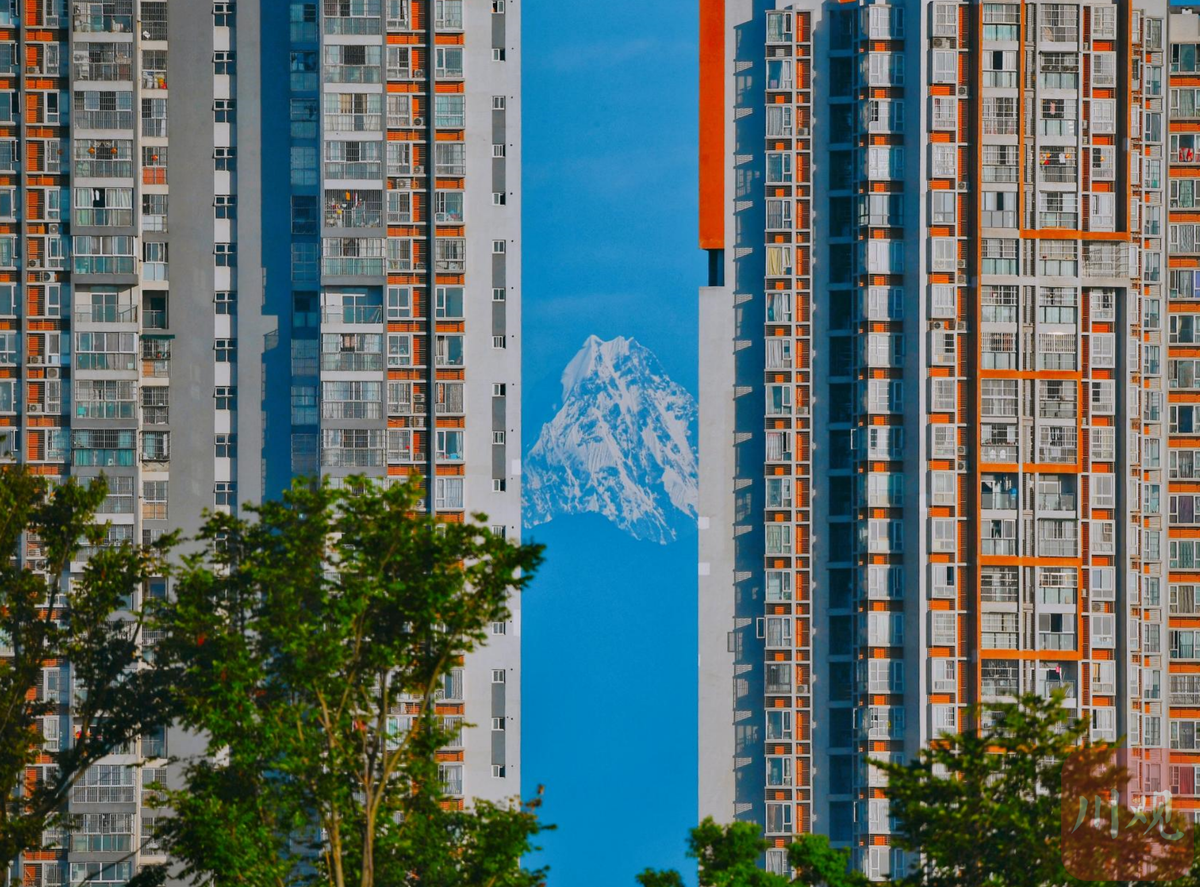 7月28日,清晨,在成都市郫都区两个楼盘中间望见的幺妹峰,雪山好似被镶嵌在一幅油画中。